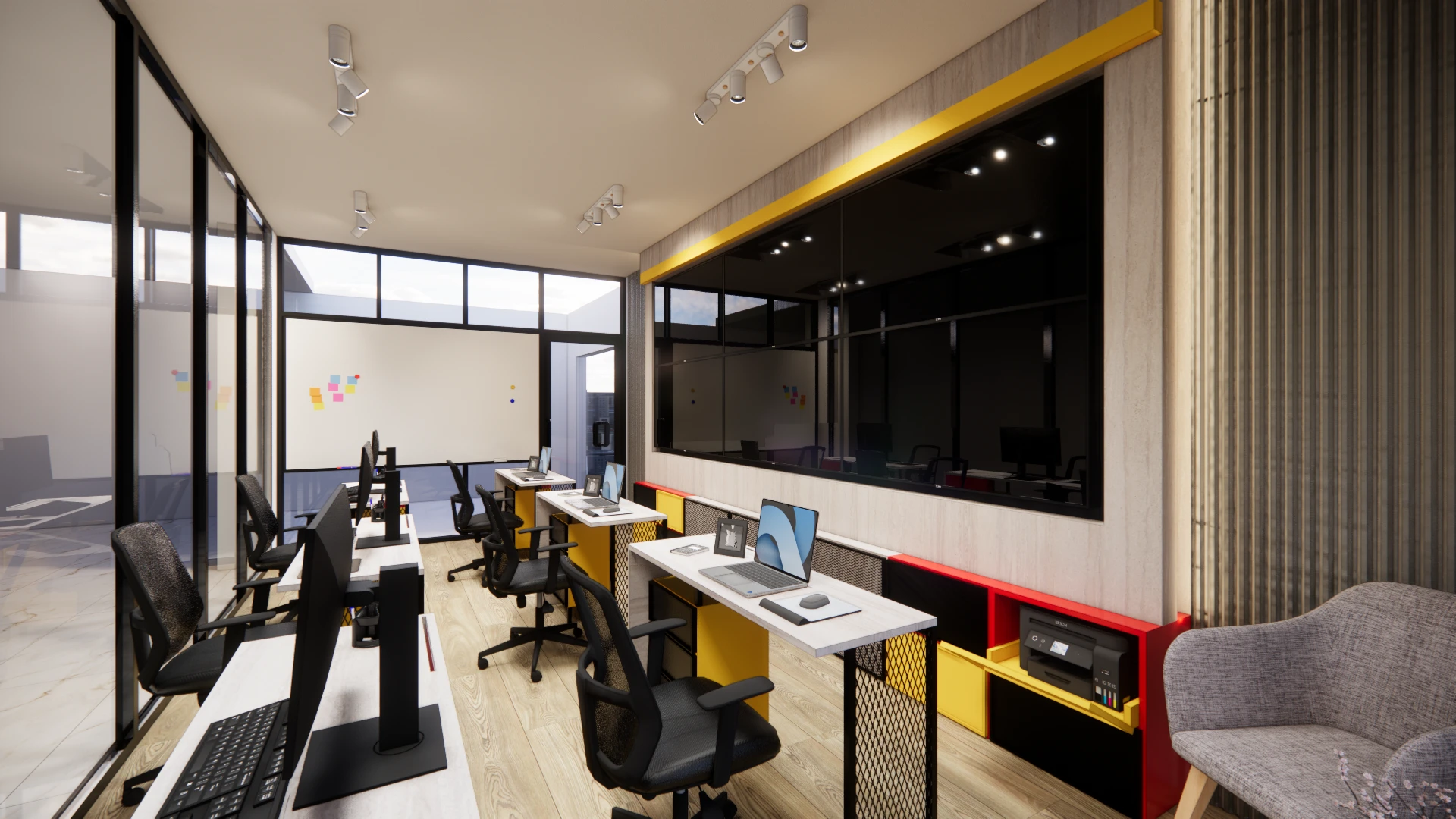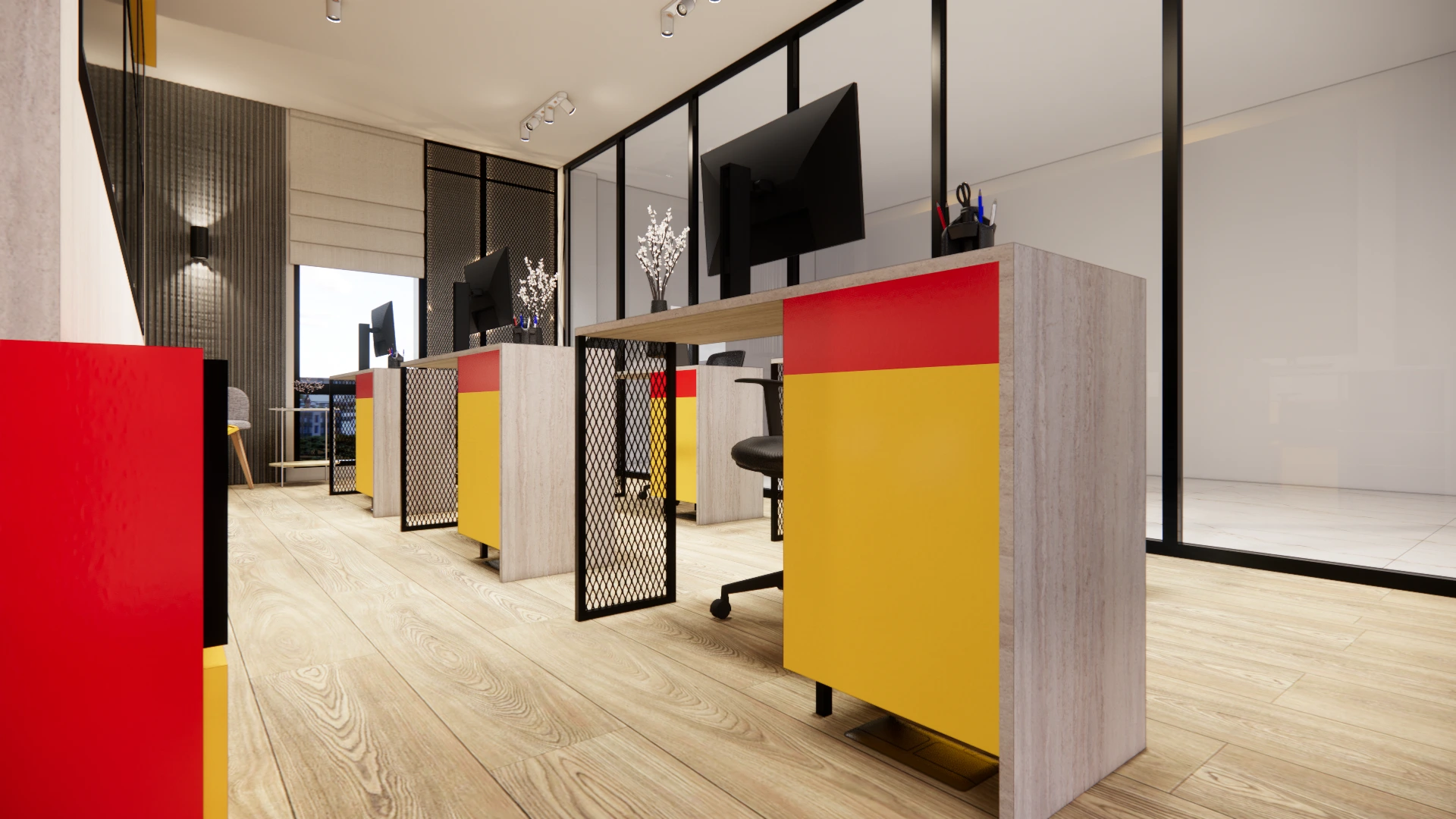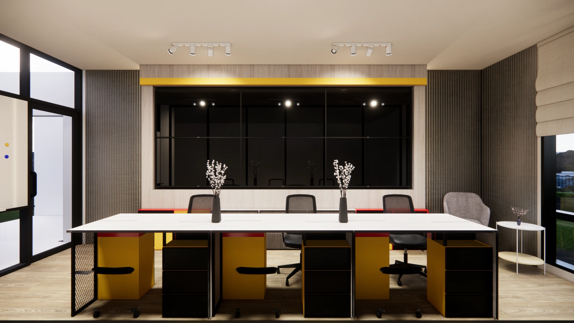 This operator room is designed to optimize visibility by positioning screens where they are easily viewable by all personnel. The table is intended to be modular, allowing it to be reconfigured as a long meeting table when required. Additionally, each workstation will be equipped with power outlets beneath the desks to minimize cable clutter. The office theme will be distinctive, incorporating the brand’s color palette for a cohesive and integrated appearance.