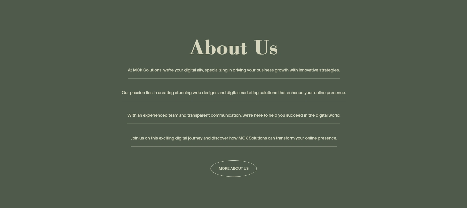 Solution I took the lead in designing and developing the website on Webflow, leveraging its CMS capabilities for seamless content updates. The solution involved creating a visually appealing and modern design that reflected McK Solutions' brand identity. The inclusion of a custom loading screen added a touch of uniqueness, enhancing the overall aesthetic. The result was a dynamic, user-friendly website that met their specific requirements.