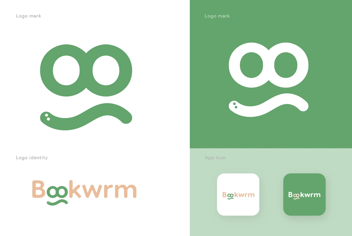 Playful reading app brand identity with friendly worm character. Warm, approachable design encouraging literary exploration.