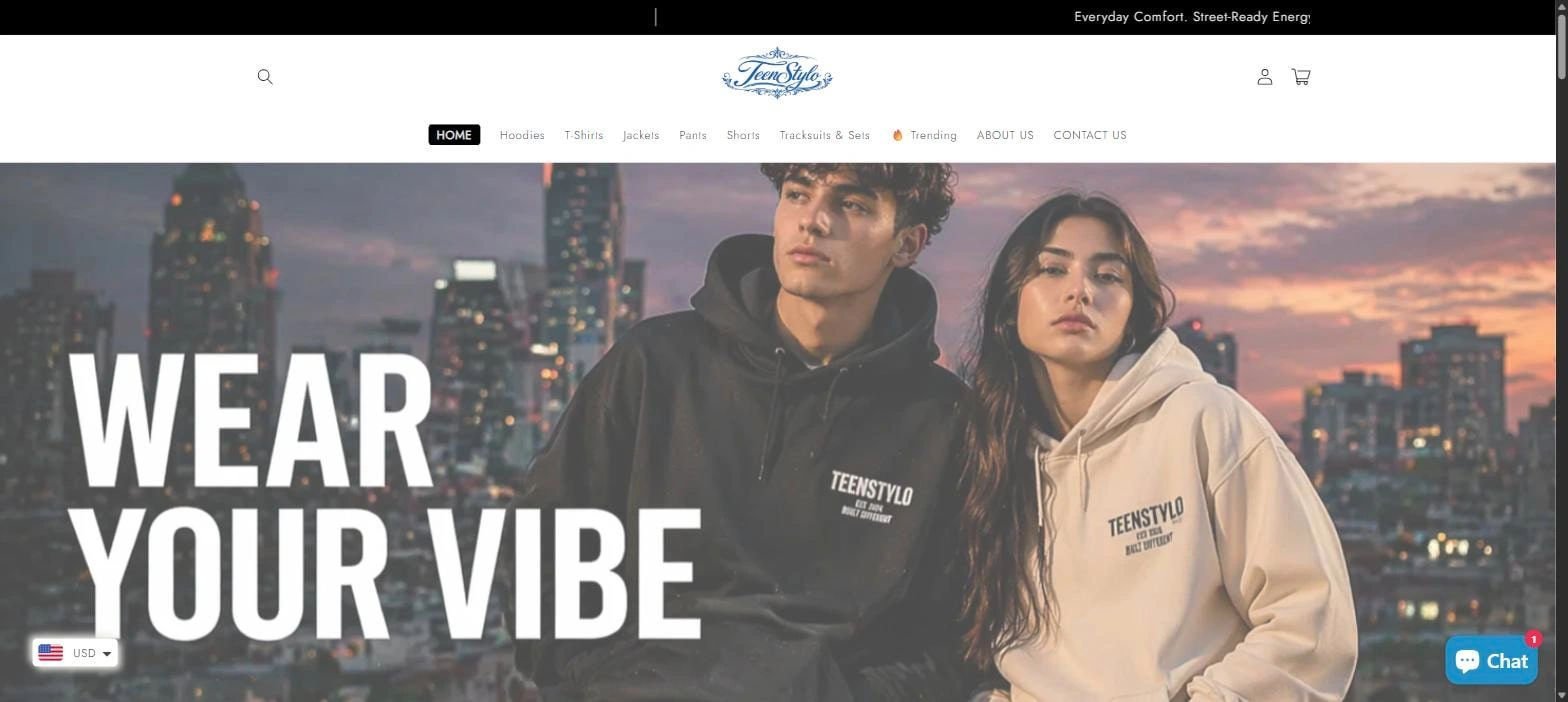 TeenStylo came to Digital Heroes with a clear vision โ a premium streetwear brand targeting Gen Z shoppers across the UK, US, and Australia โ but no digital presence at all. No website. No online store. Just great products, no way to sell them. They needed a full Shopify store built fast, with worldwide shipping, a catalog of 199+ products, and a brand identity strong enough to compete with established streetwear labels from day one.