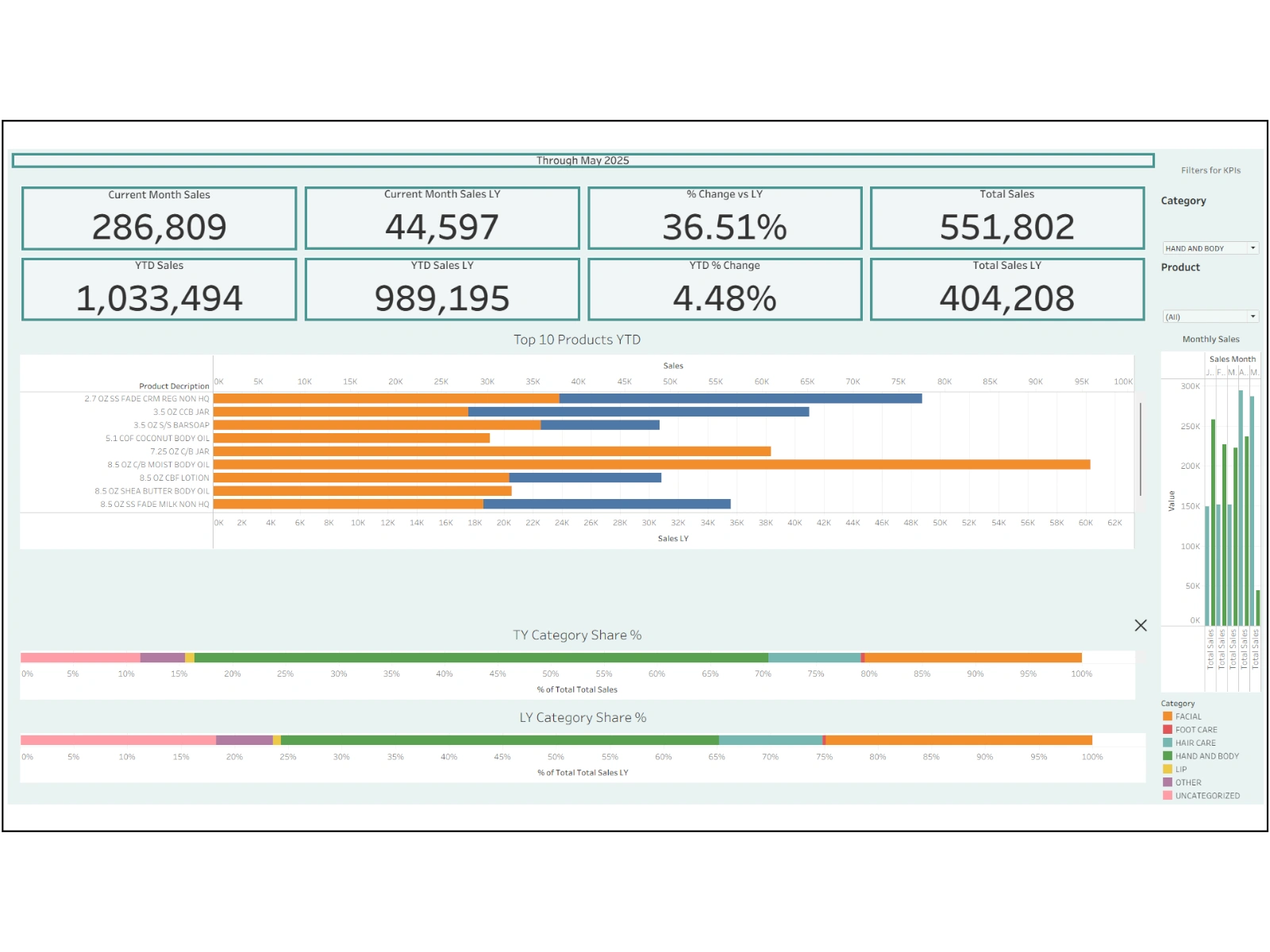 Converted static Excel sales table into an interactive Tableau waterfall, exposing monthly changes and reducing manual updates.