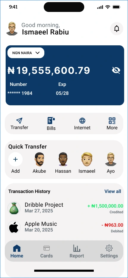 Daily Usage: Quick view of balance, recent transactions, and easy transfers.