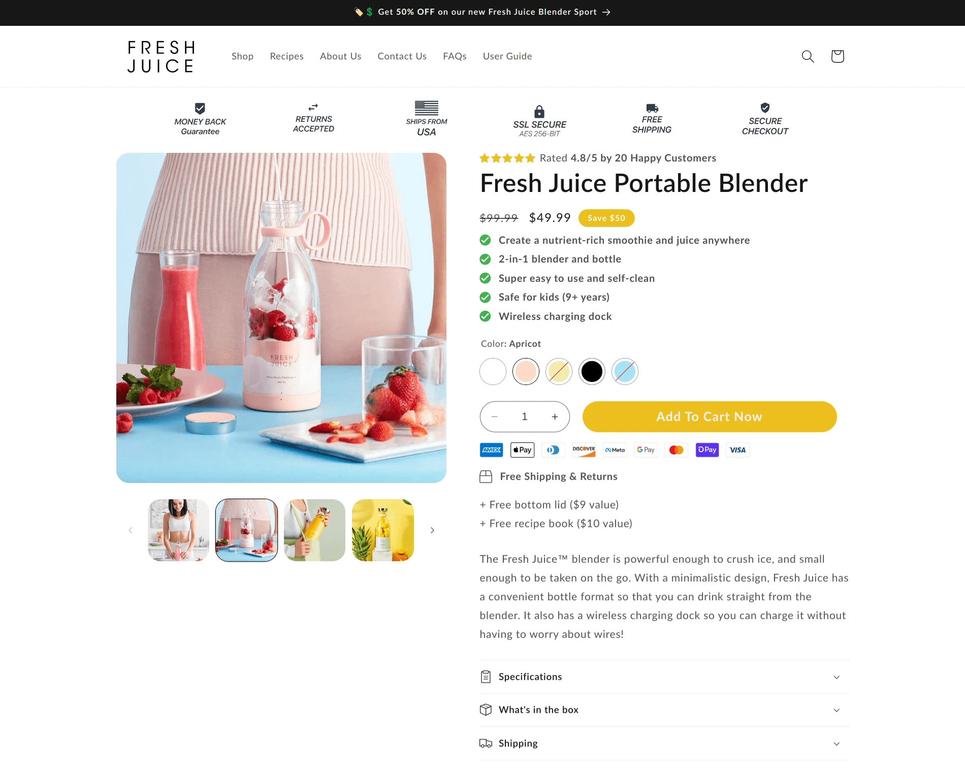 Designed and developed this high-converting product page for a dropshipping store selling a portable blender on Shopify.