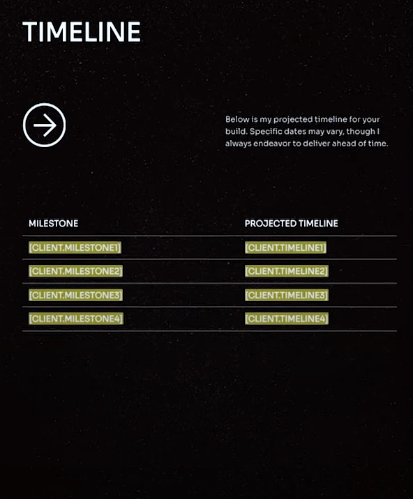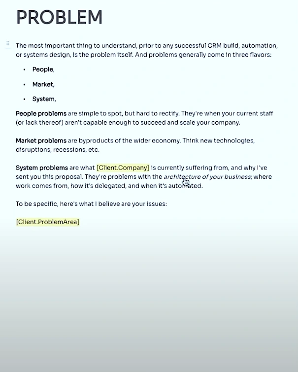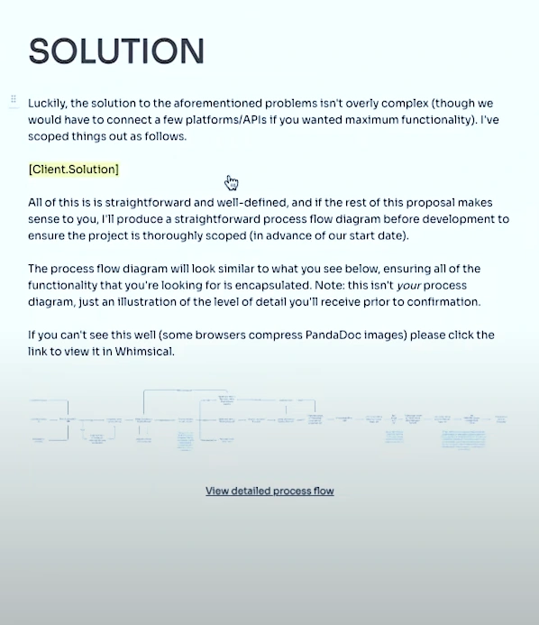 Some images of a typical proposal. Unfortunately I cannot share the actual system due to my non-disclosure agreement with the client. But below are some typical screenshots of a pandadoc in a very generic form. The automation system fills in anything in yellow.