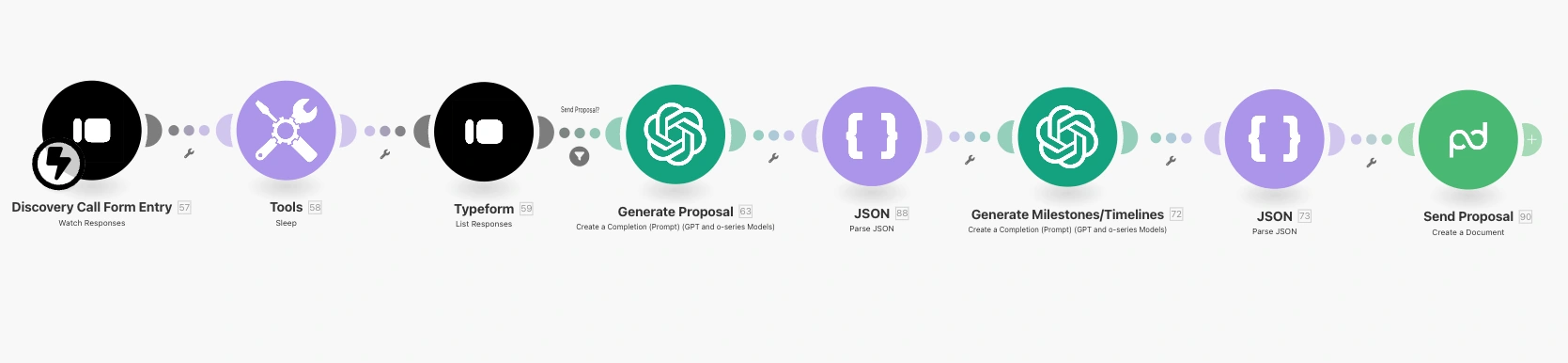 This project showcases my expertise in process optimization, integrating advanced AI capabilities, and building robust automation workflows using Make.com, Typeform, OpenAI, JSON, and PandaDoc to drive tangible business results and demonstrate the power of systems in action.