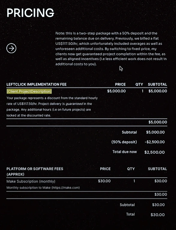 Instant Delivery & Payment: The complete proposal is then automatically emailed to the client via Make.com's email module, enabling immediate review, digital signing, and payment directly through PandaDoc.