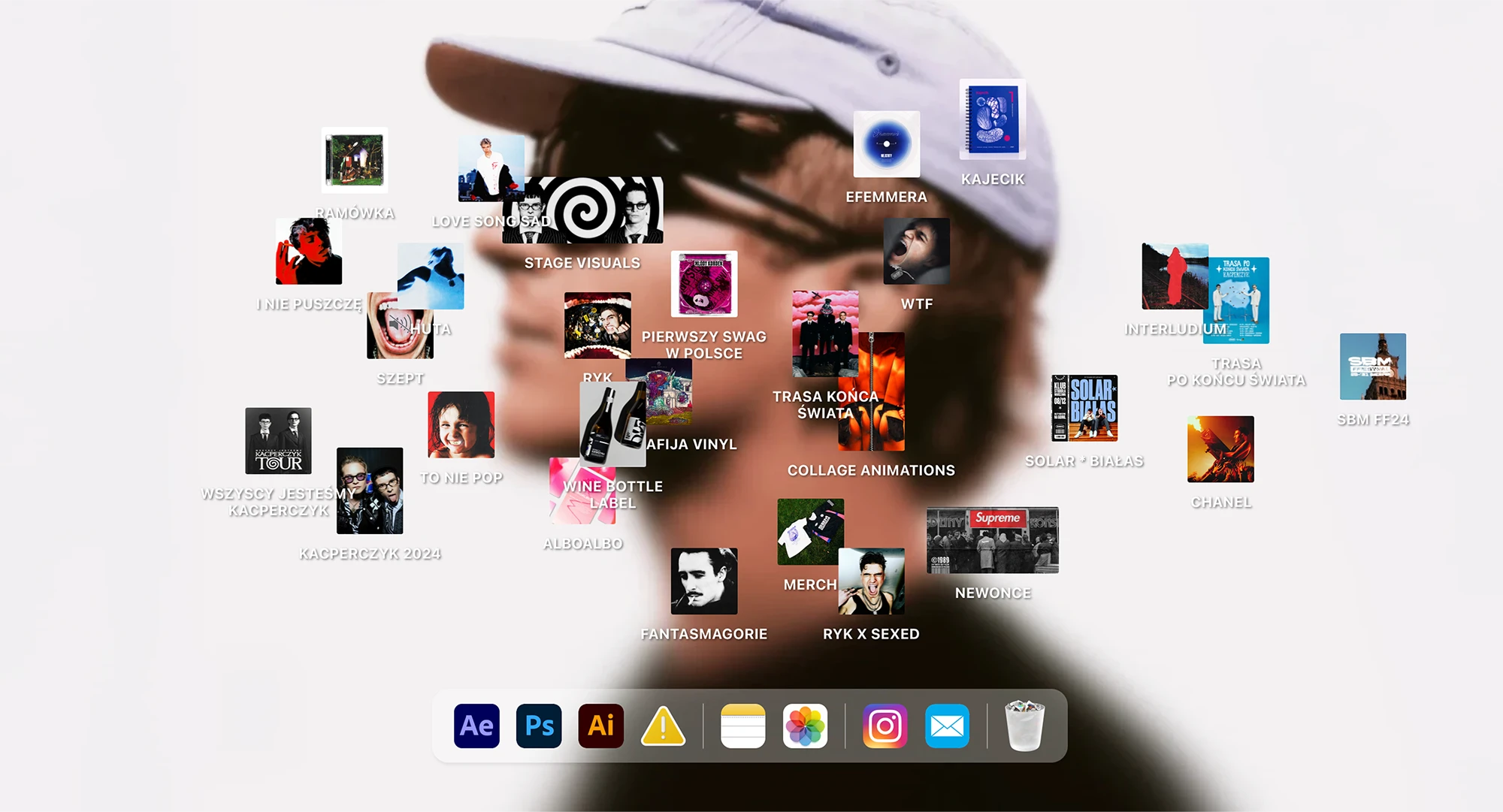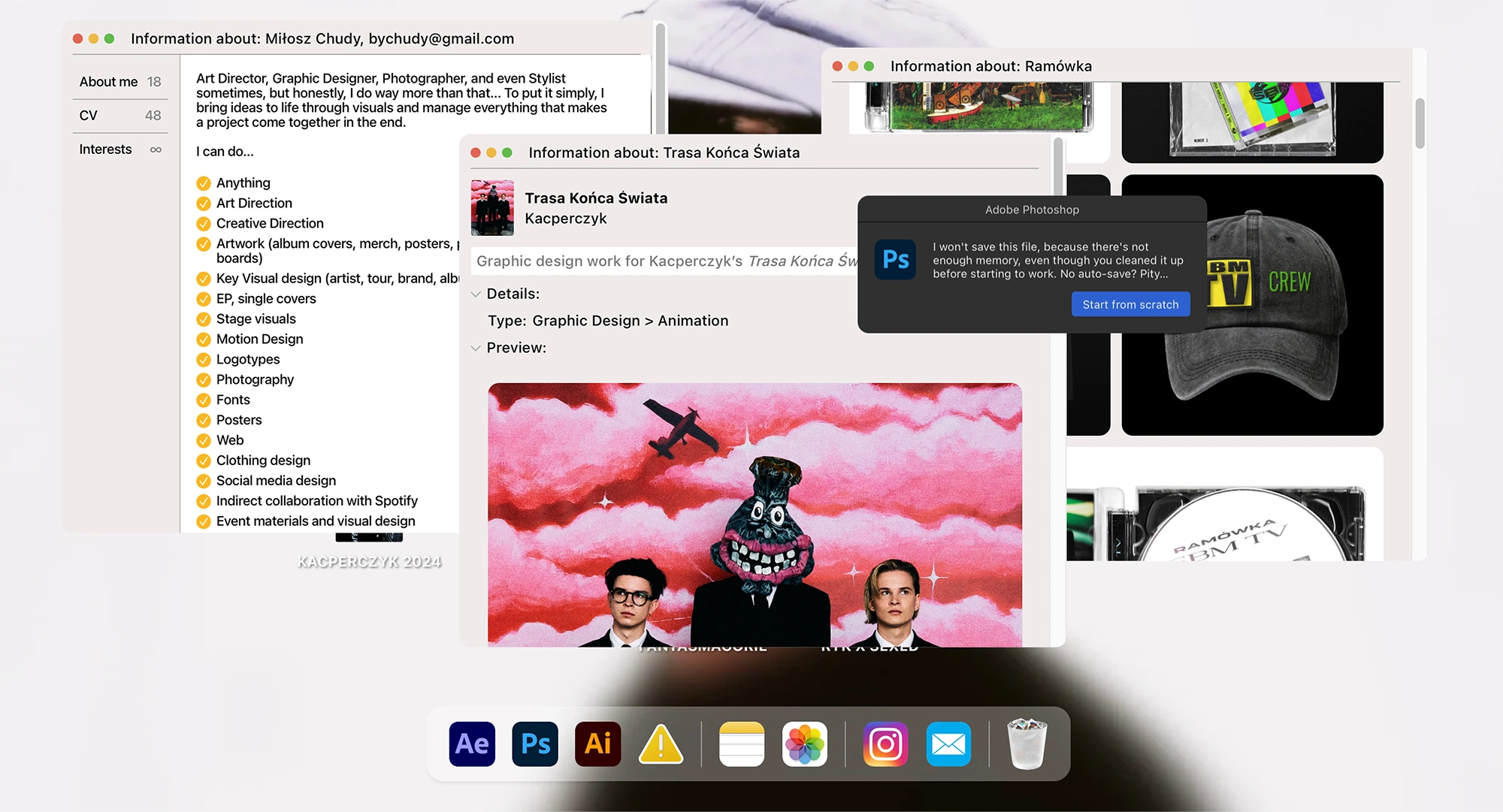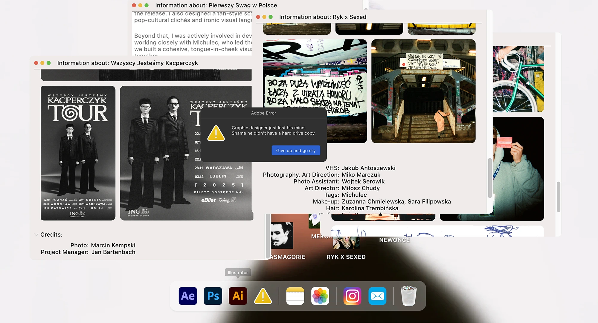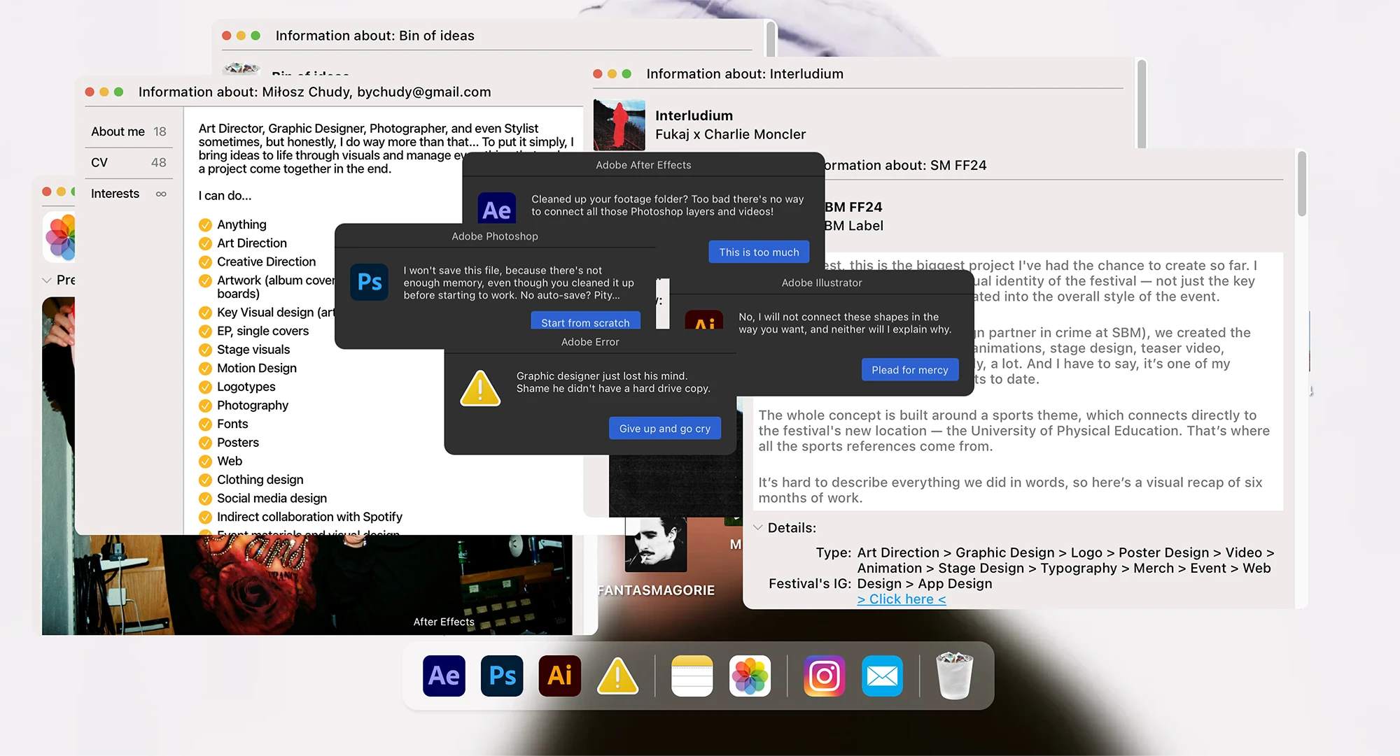 A MacOS homage built from creative clutter – overlapping windows and icons forming a functional, artful mess