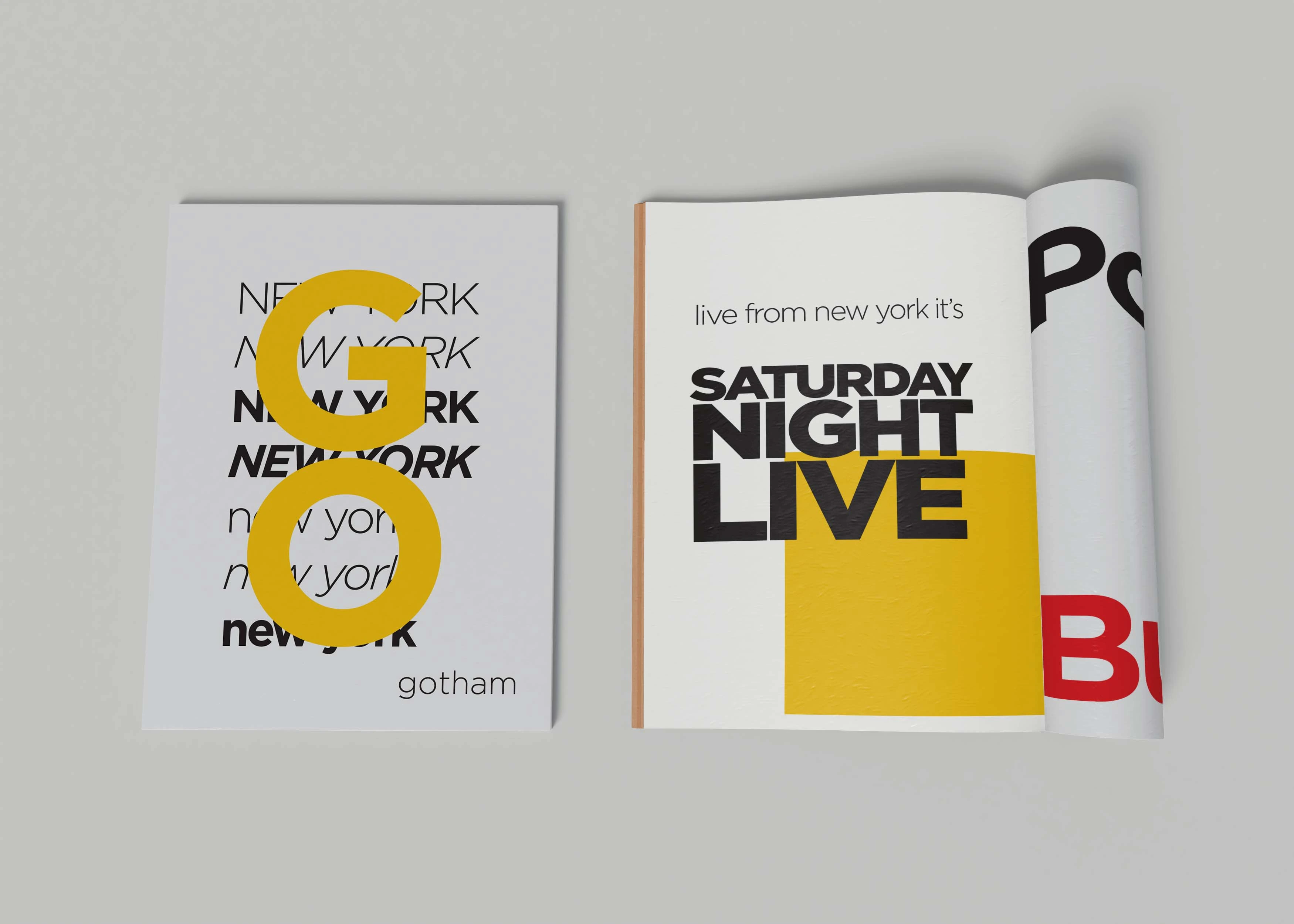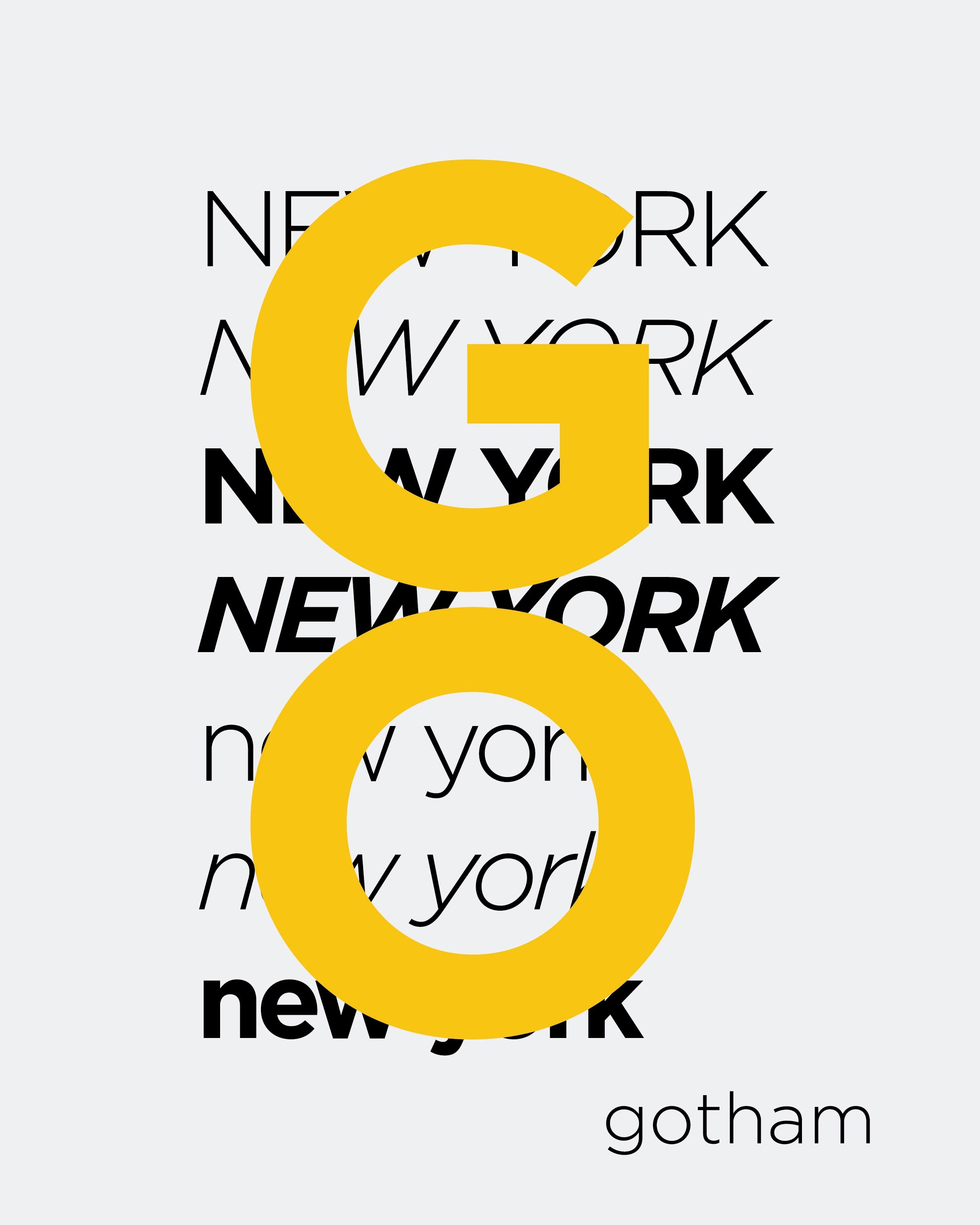 After countless research, I decided to go with a sans serif that had various weights and styles. Gotham is a very versatile font and is used in different ways. Gotham is used in popular and well-known companies such as Spotify, NBC Saturday Night Live, etc. I wanted to give this font a fun modern look and relate it to New York as well and it is almost a subway-type vibe.