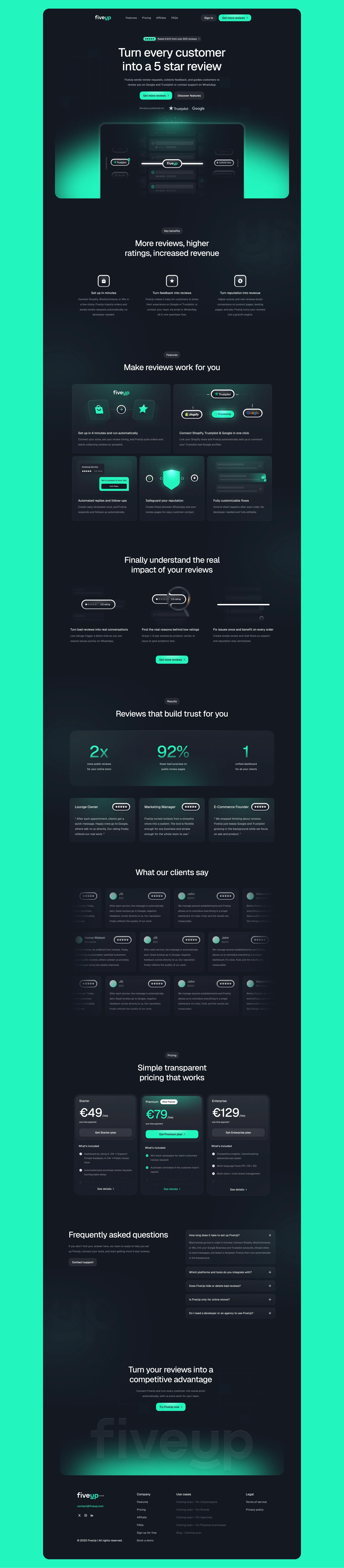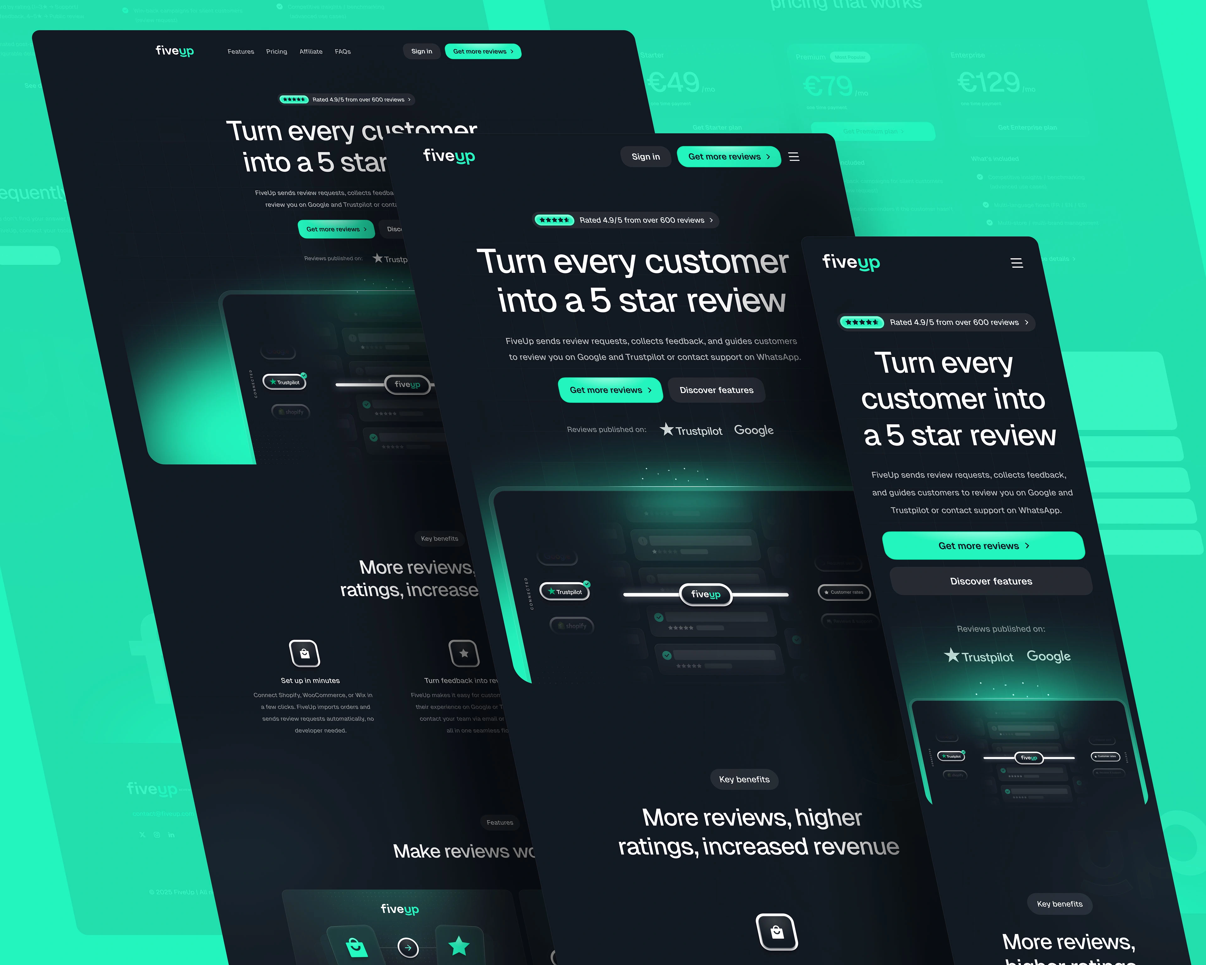 Redesigned FiveUp’s landing page to clarify positioning, showcase its automated review flow, and improve conversion with a modern SaaS dark mode aesthetic.