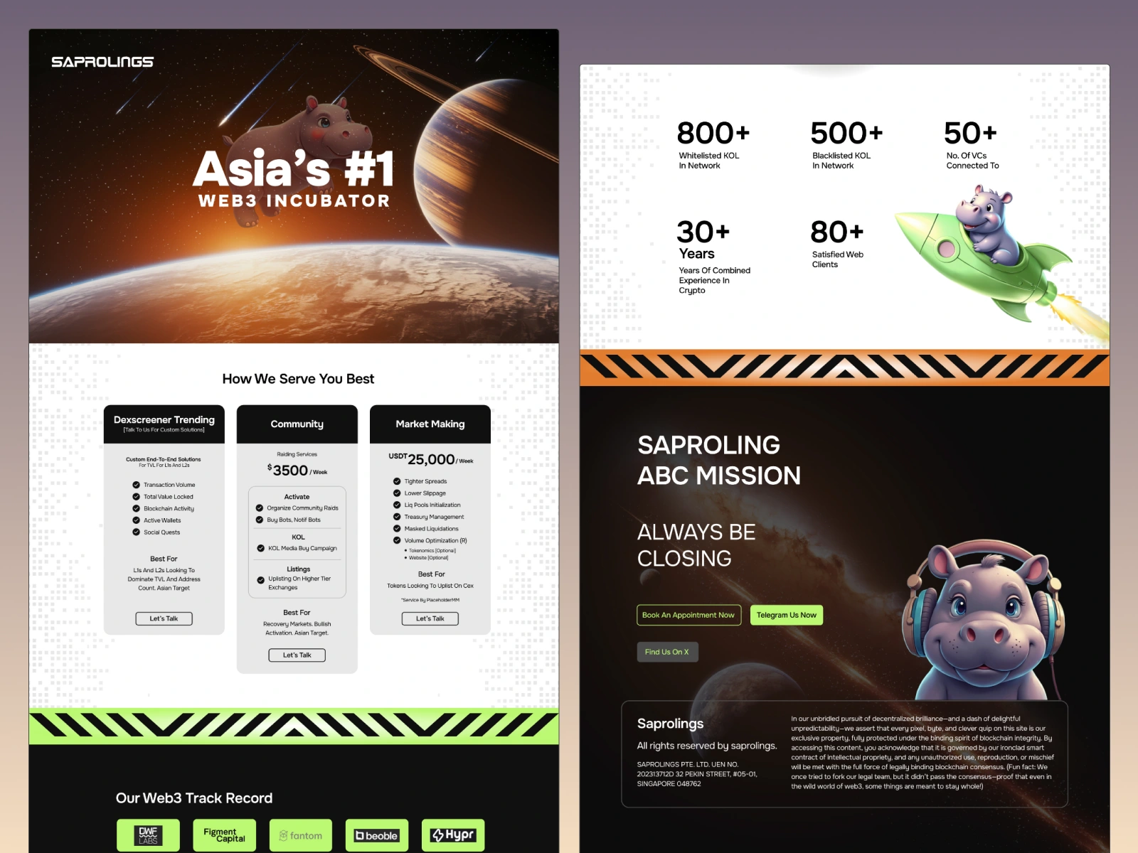 Designed Saprolings Web3 incubator UI/UX with space theme, AI visuals, clear CTAs, and crypto-focused content for strong user engagement.