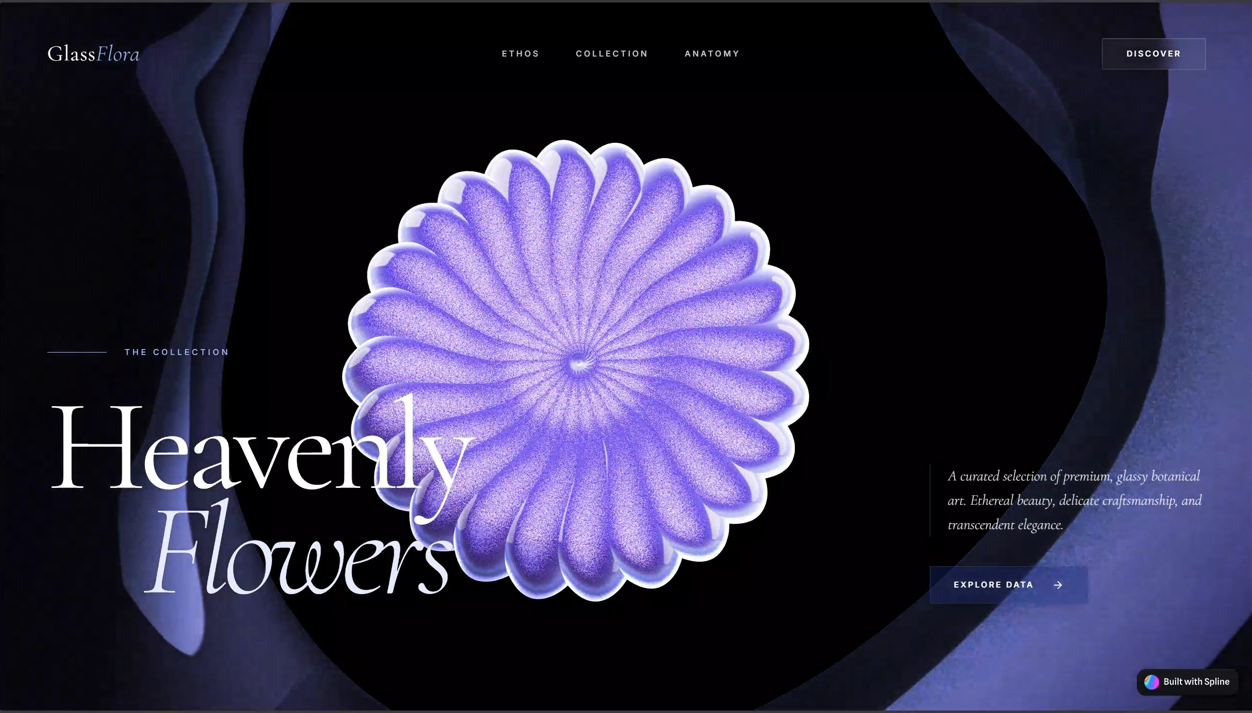 This project explores a glass botanical concept used inside a hero section. At the center is a glass flower built in Spline and placed as the main visual element of the page. The flower rotates slowly and acts as the focal point while the surrounding layout introduces the concept of a premium botanical collection.