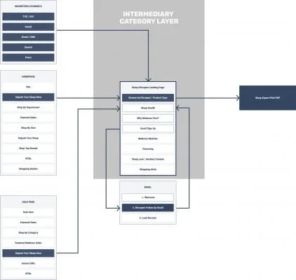 To start the information gathering process, I reached out to SMEs to do stakeholder interviews, and worked with our data analysts and researcher. Data from MattressMatcher quiz was pretty useful – it told us the top 2 sleep disruptors (1. pain 2. sleep apnea). We also ran unmoderated user research tests using usertesting.com.