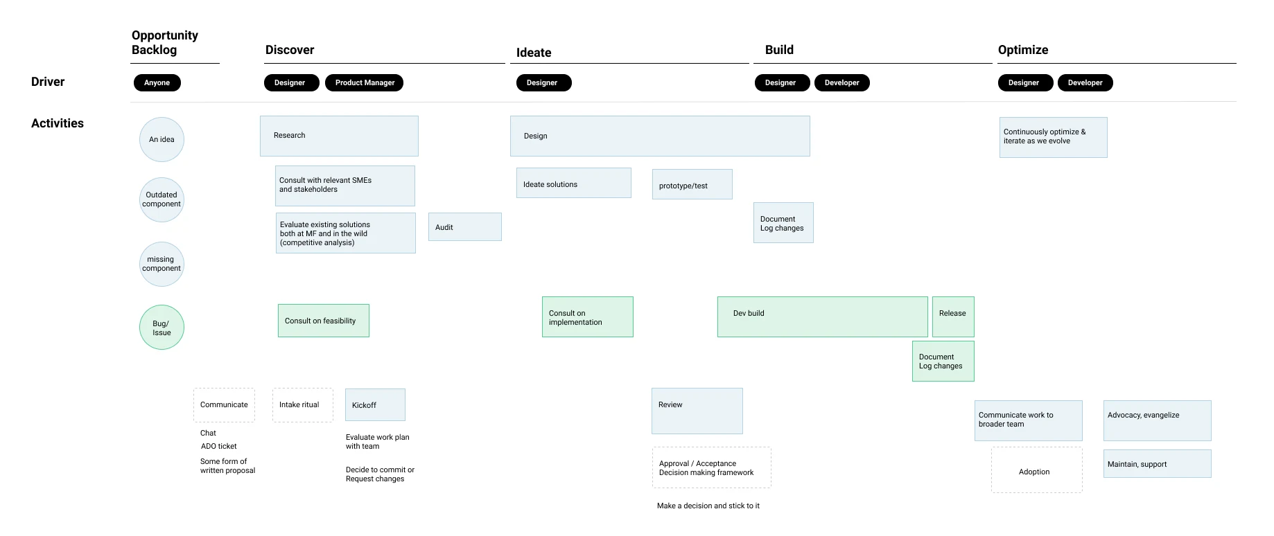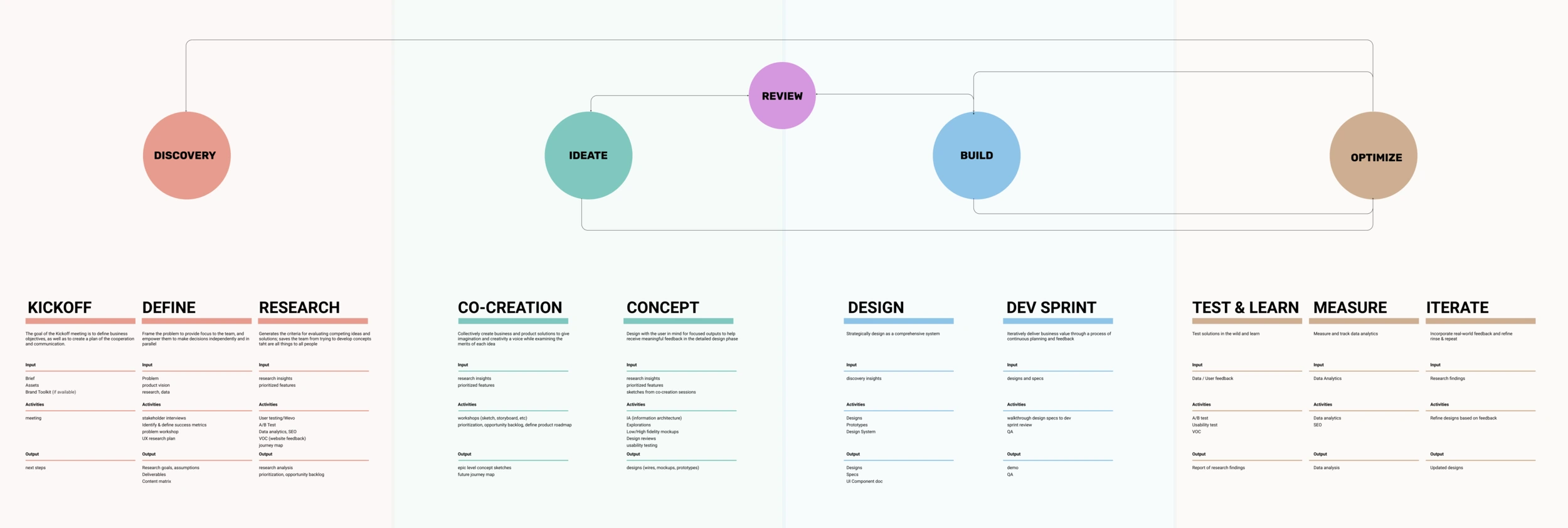 I use a user centered and agile process throughout the product development lifecycle. The full process, mapping inputs and outputs, served as a loose checklist for the team, ensuring quality and rigor.