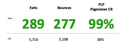 A/B test results showed immense lift in PLP page views as well as improvement in exit rate and bounce rate with the new designs.