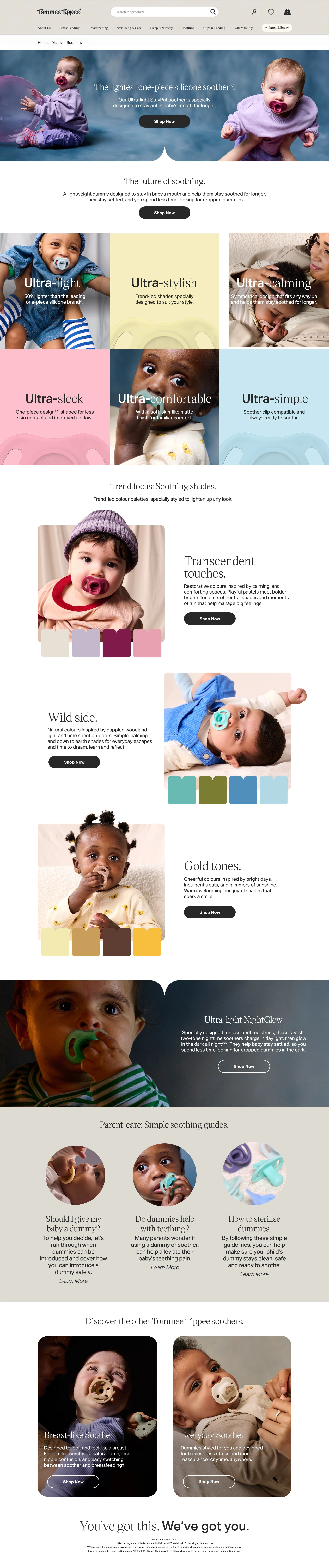 I worked collaboratively with the team and led UX research to understand how parents shop for soothers and what influences their decisions. Using a mix of keyword research, behavioural insights, and user testing, I focused on uncovering the language, cues, and reassurance parents needed to feel confident buying. These insights directly informed the page structure, messaging, and visual hierarchy.