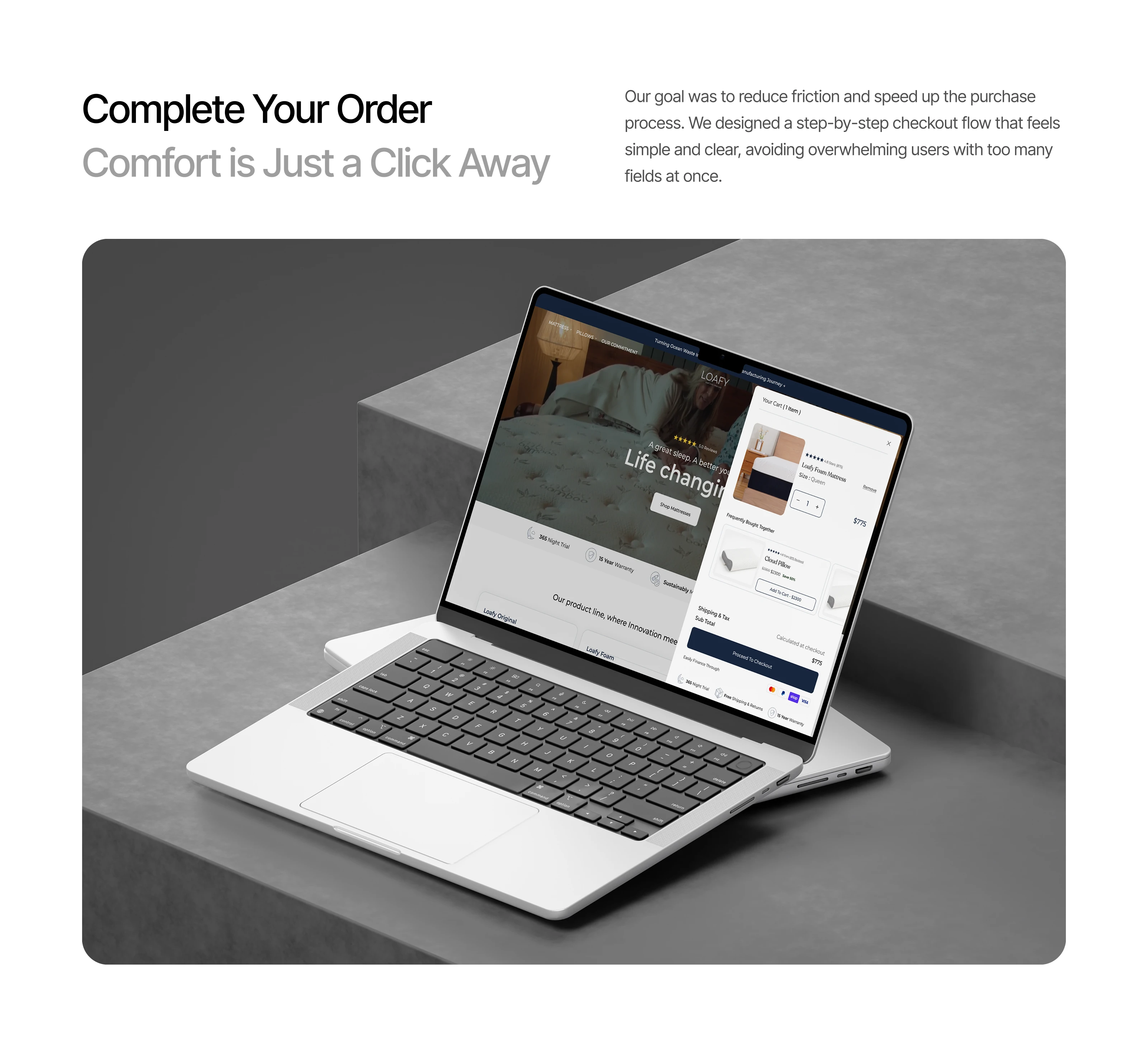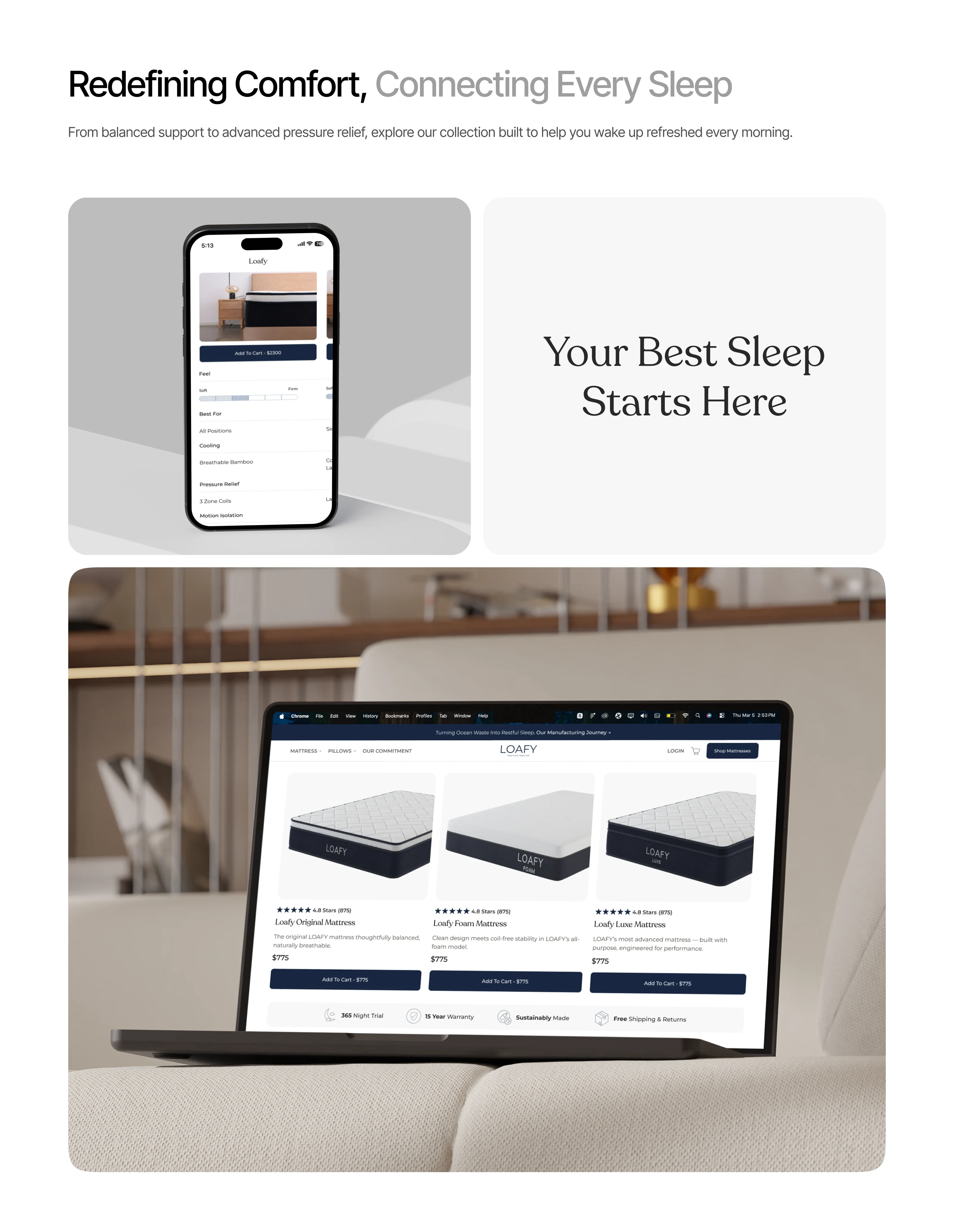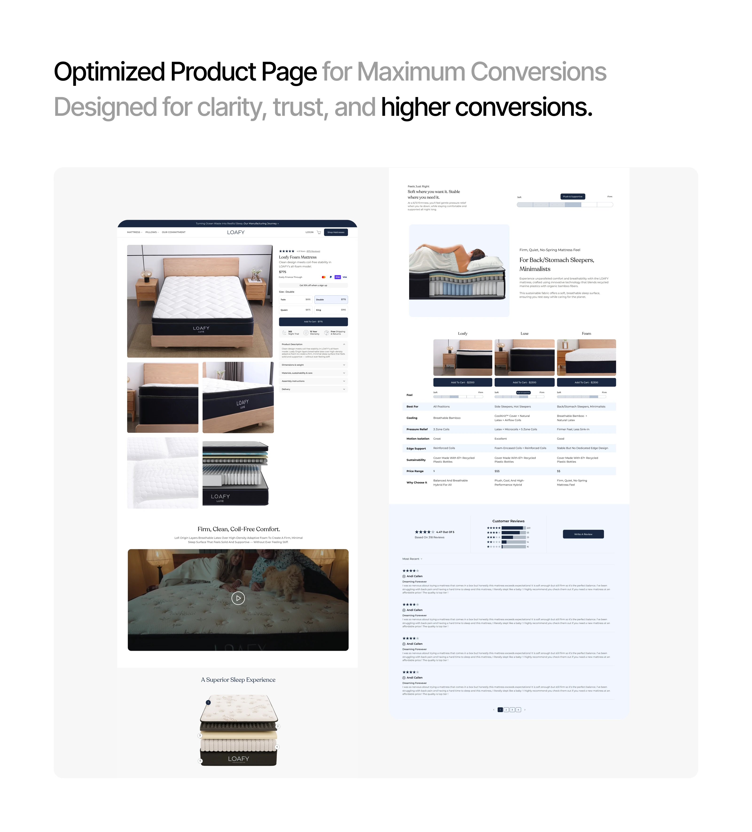 A complete web and mobile redesign for a premium mattress brand built on Shopify. The project focused on CRO optimization, clear product storytelling, and building trust across 3 key mattress products Original, Foam, and Luxe. Every screen was designed to deliver a conversion-ready shopping experience.