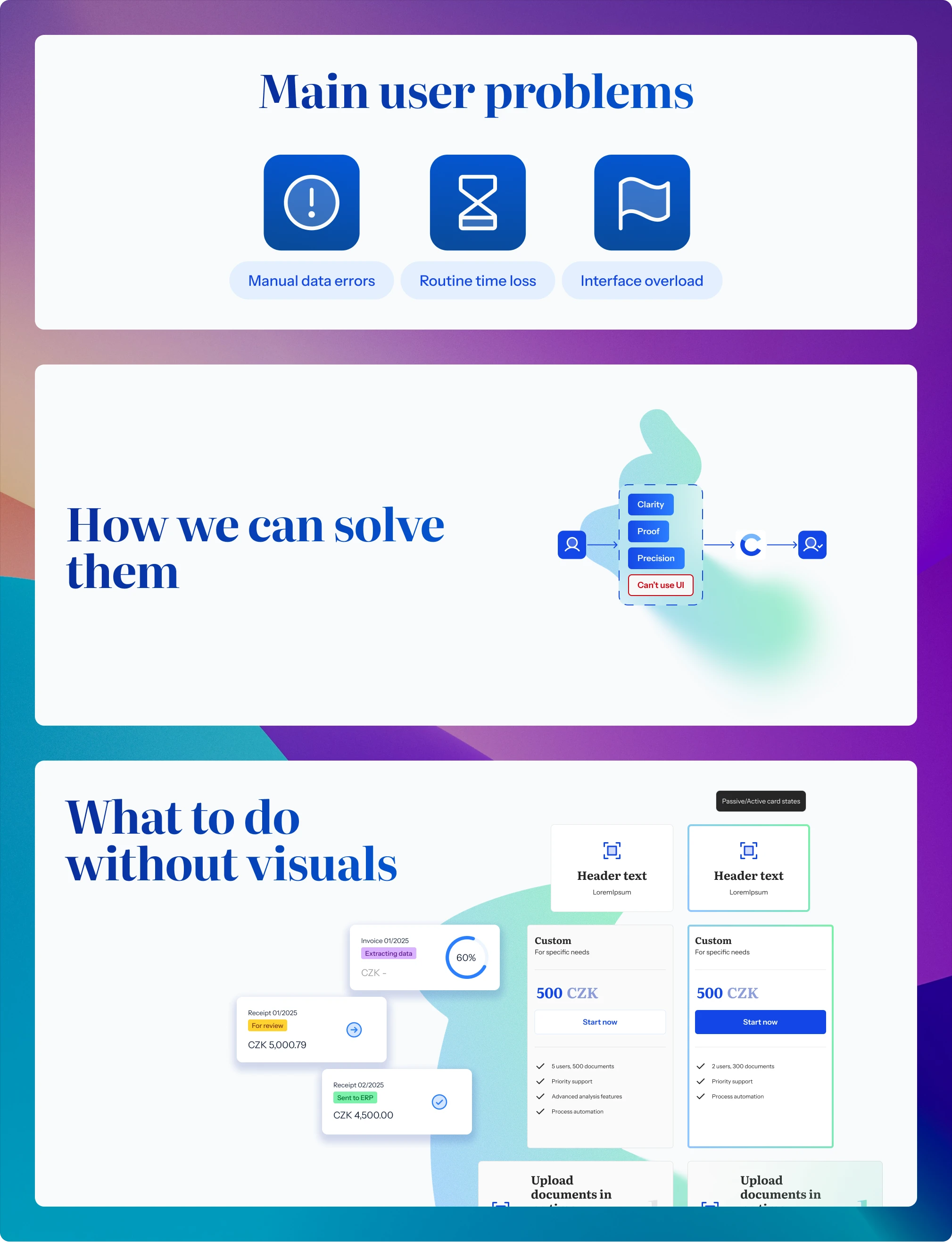 Accountants scan for precision and leave fast. Research across four competing tools mapped three recurring pain points — manual errors, repetitive processing, tool complexity. Those insights structured everything: section order, narrative, hierarchy.