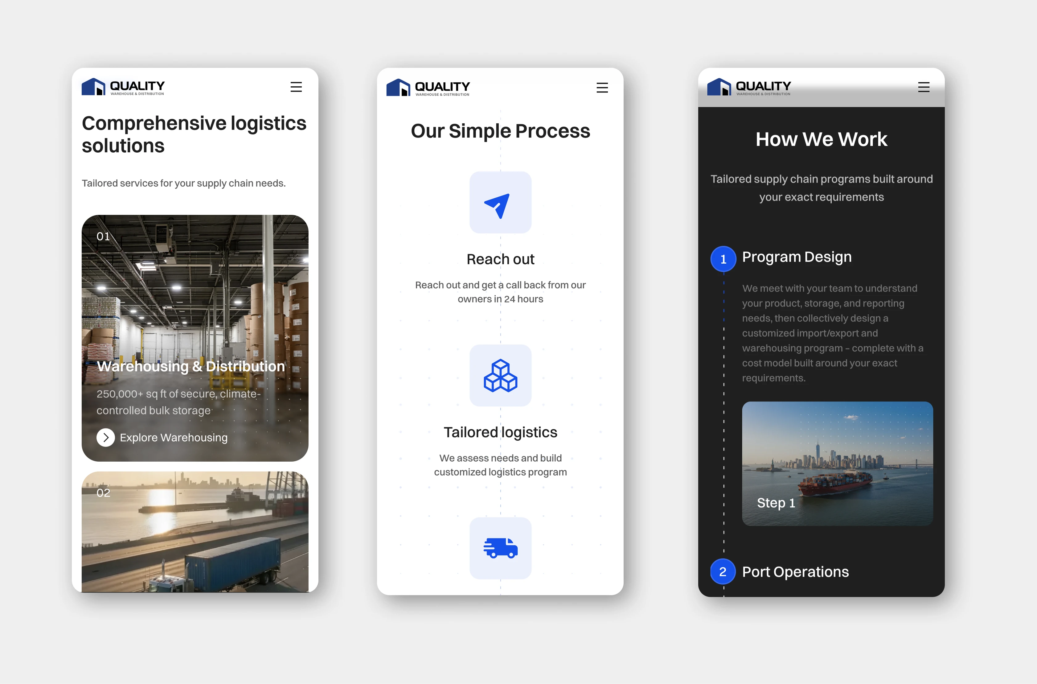 We redesigned the Quality Warehouse & Distribution website to clearly communicate a complex import and export logistics operation in a way that feels credible, modern, and easy to navigate.