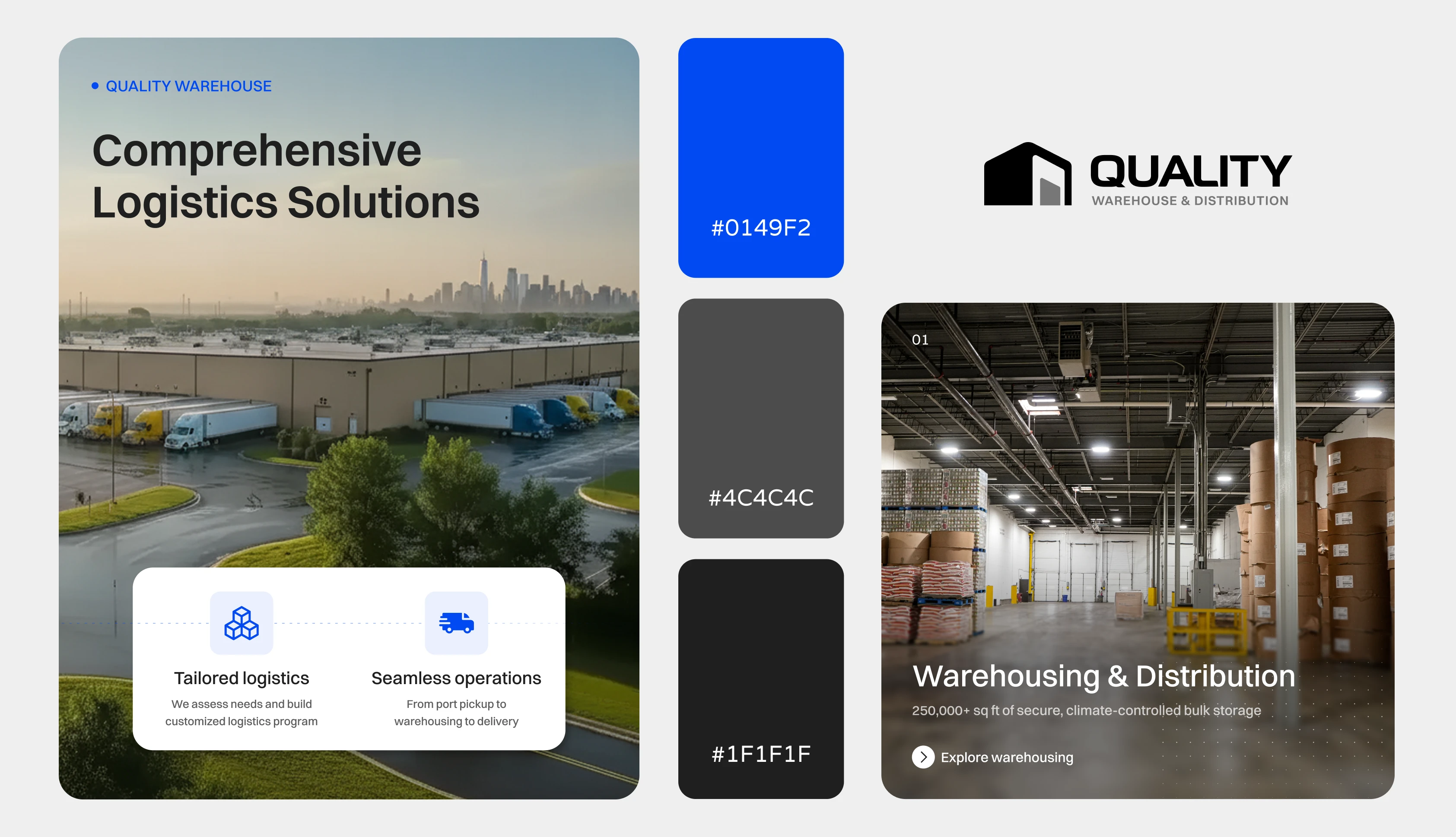 Photography and visual treatments focus on real infrastructure, facilities, and movement, reinforcing Quality’s hands-on expertise across warehousing, container transport, rail freight, and intermodal operations. The result is a brand presence that feels established, confident, and aligned with the realities of modern logistics.