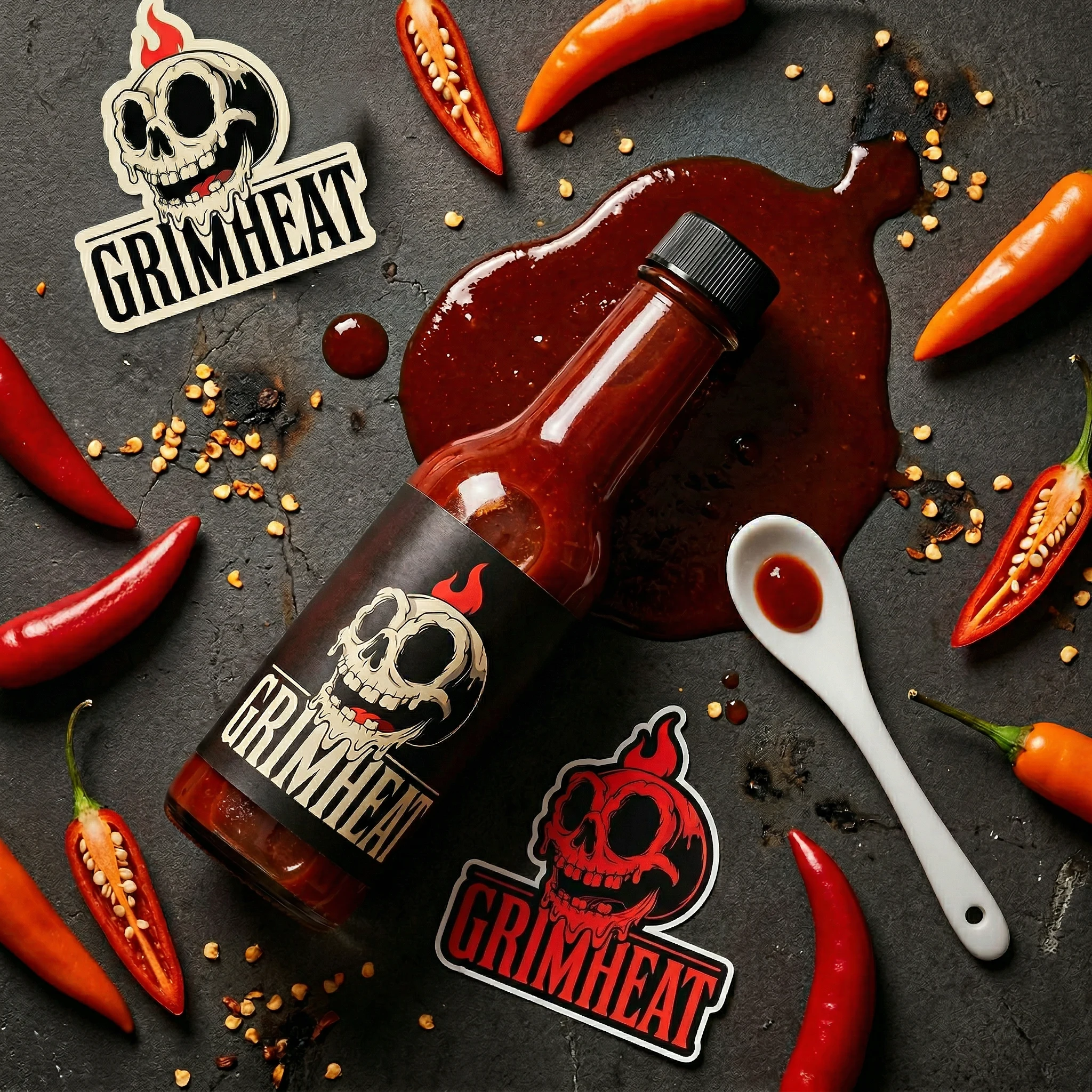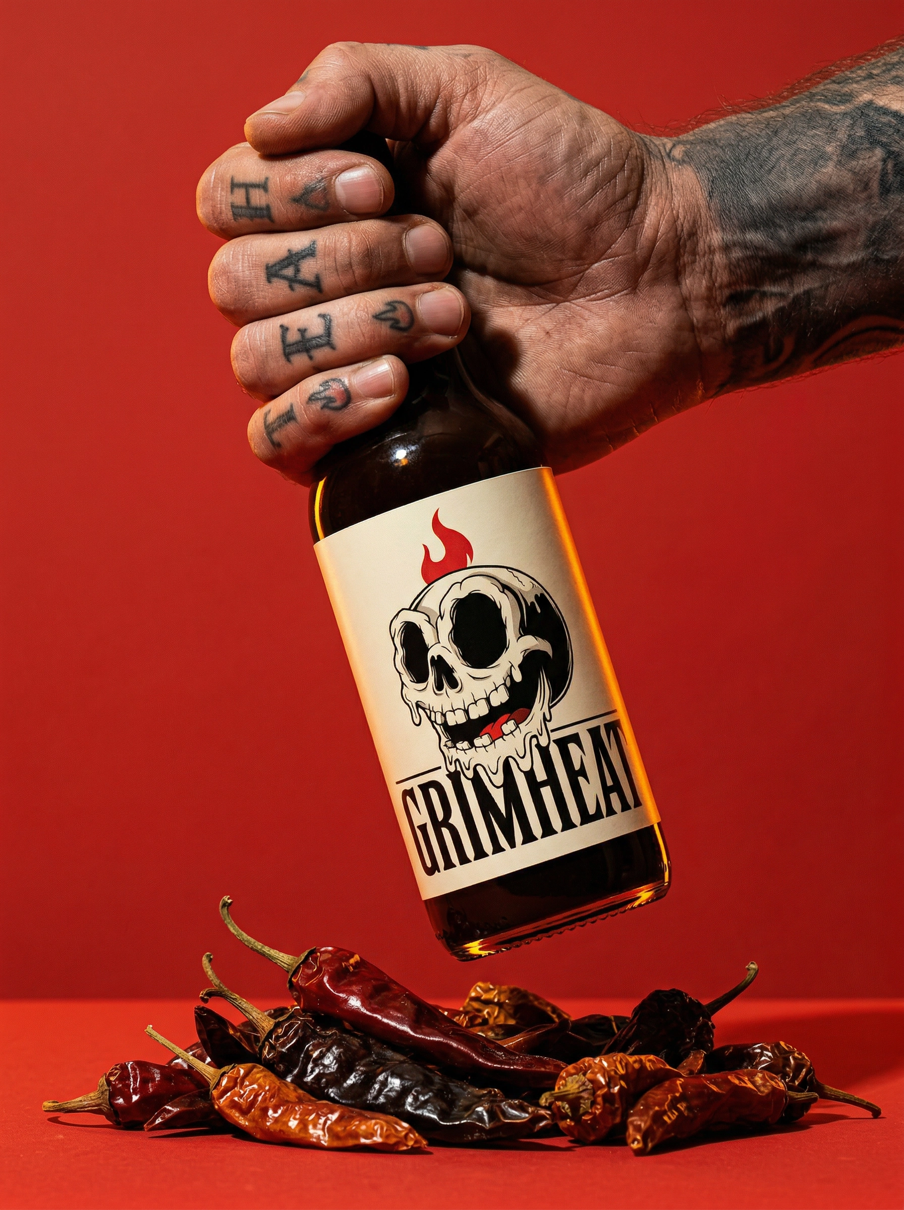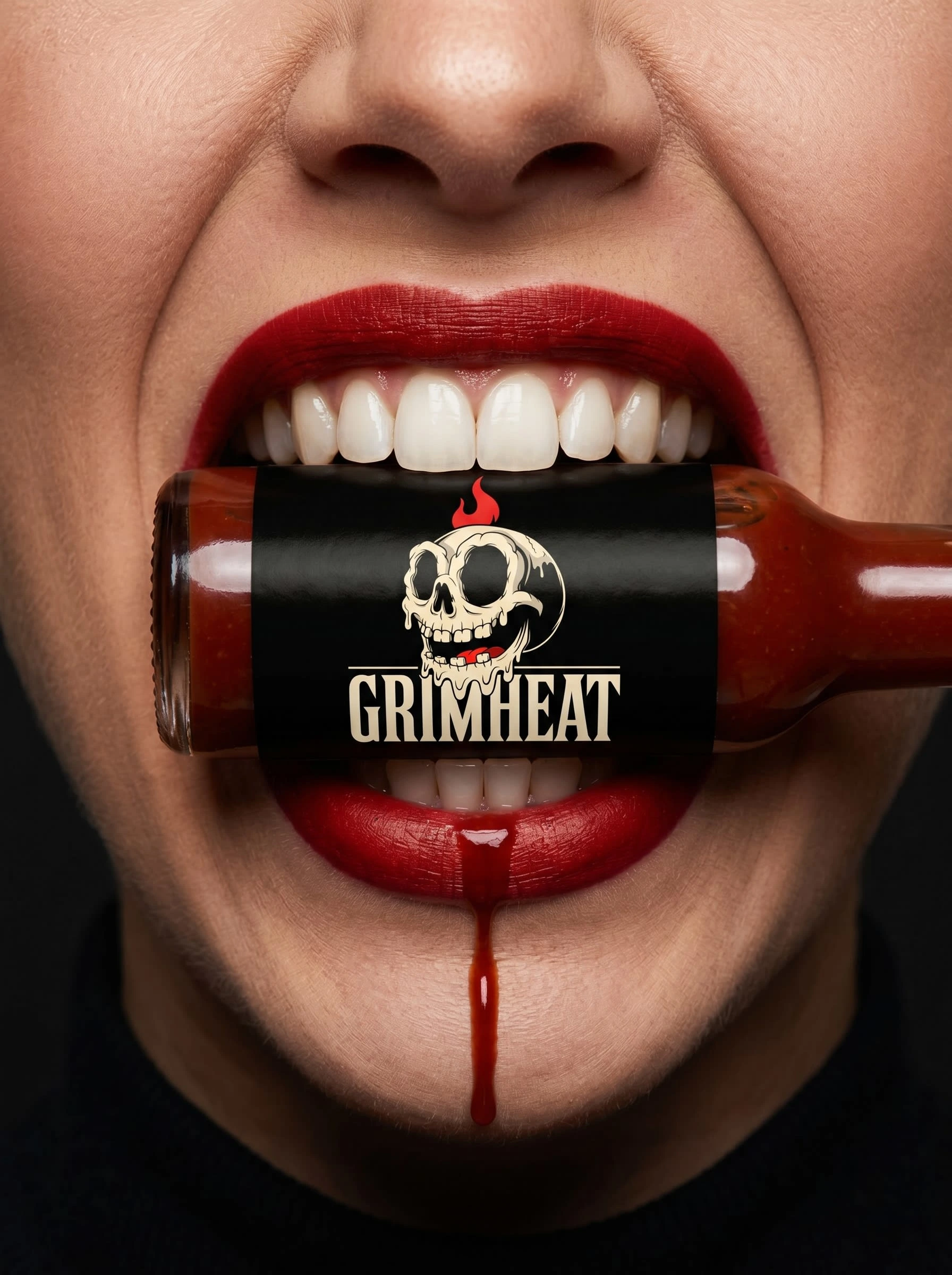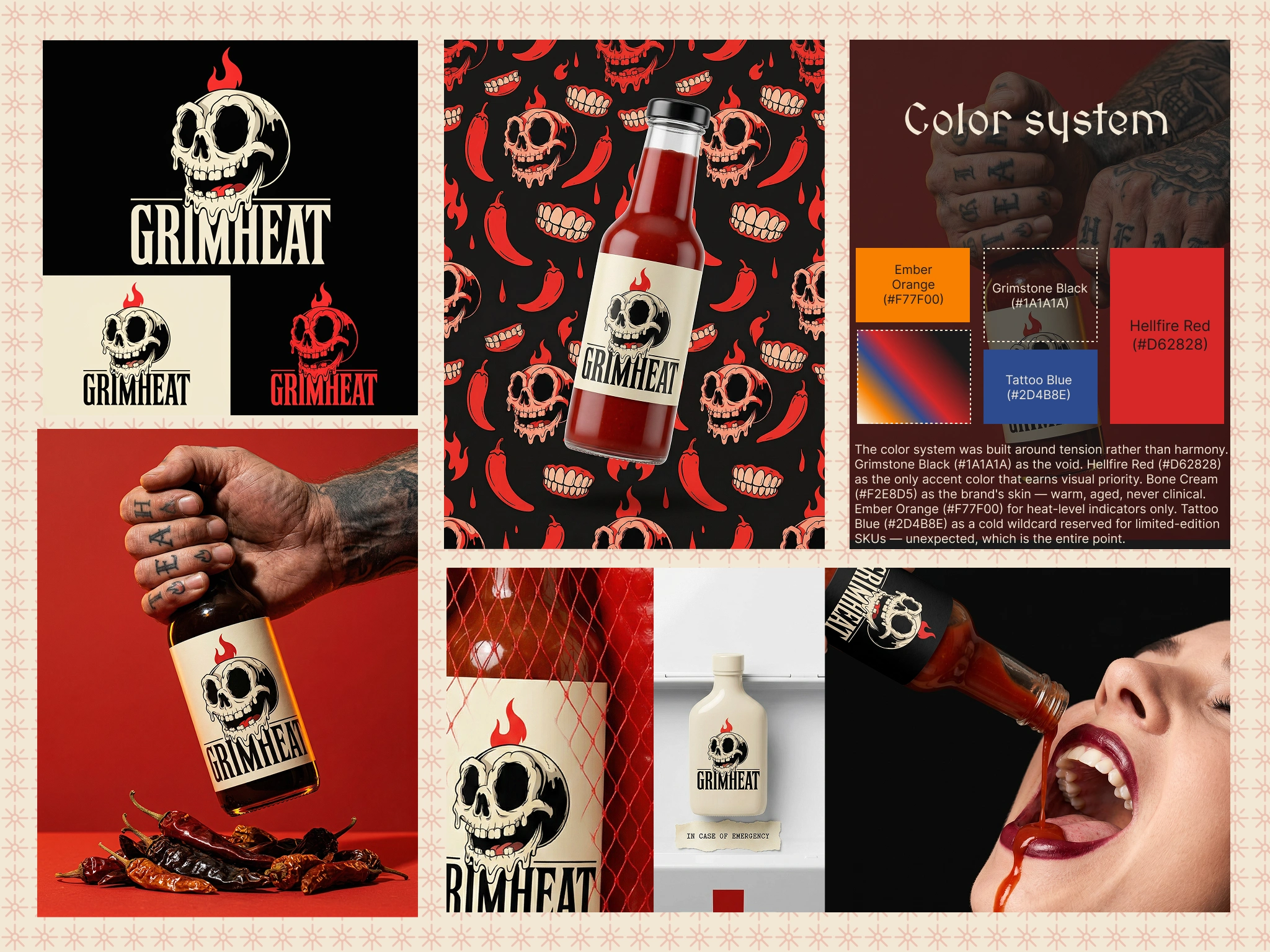 GRIMHEAT: a hot sauce brand built on cartoon-grotesque DNA. Identity system + 20 campaign mockups across three visual worlds.