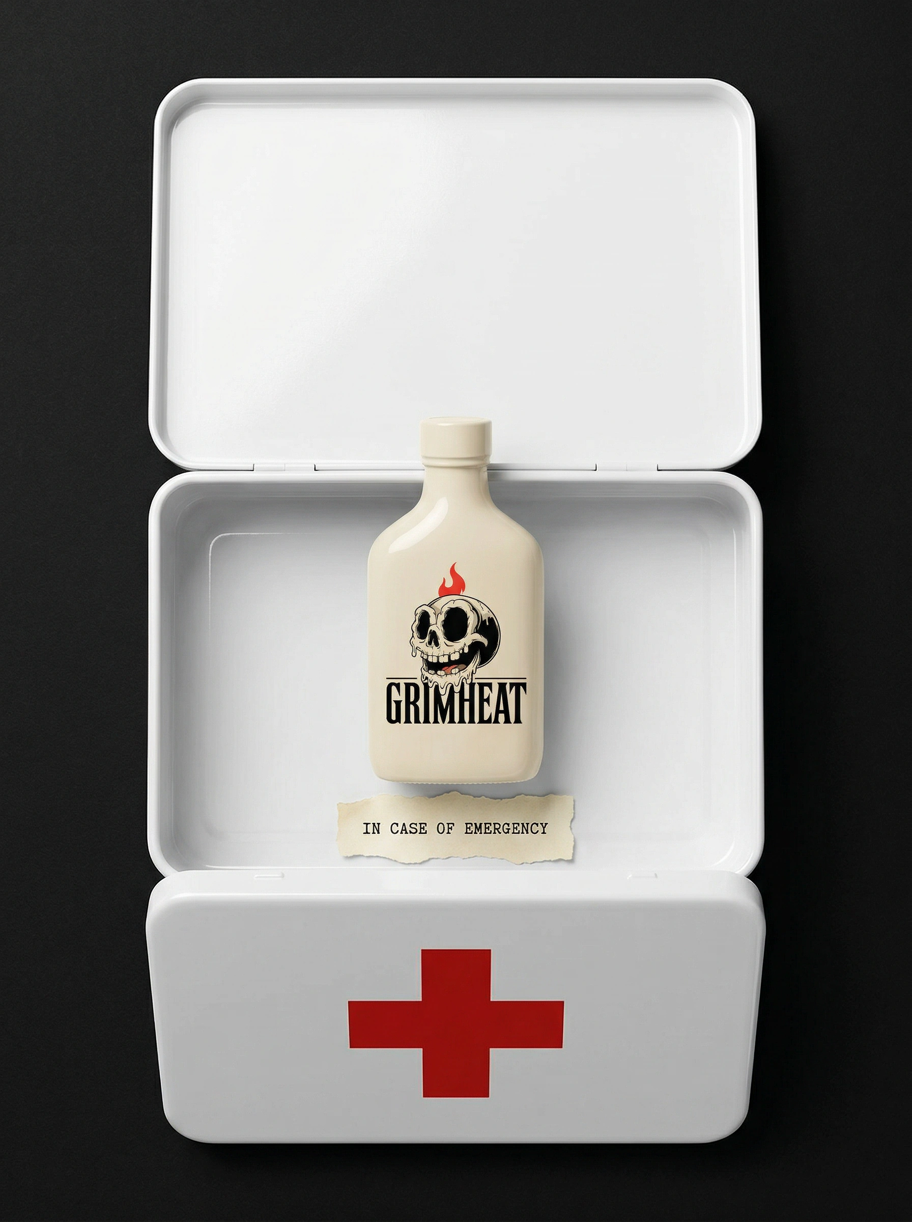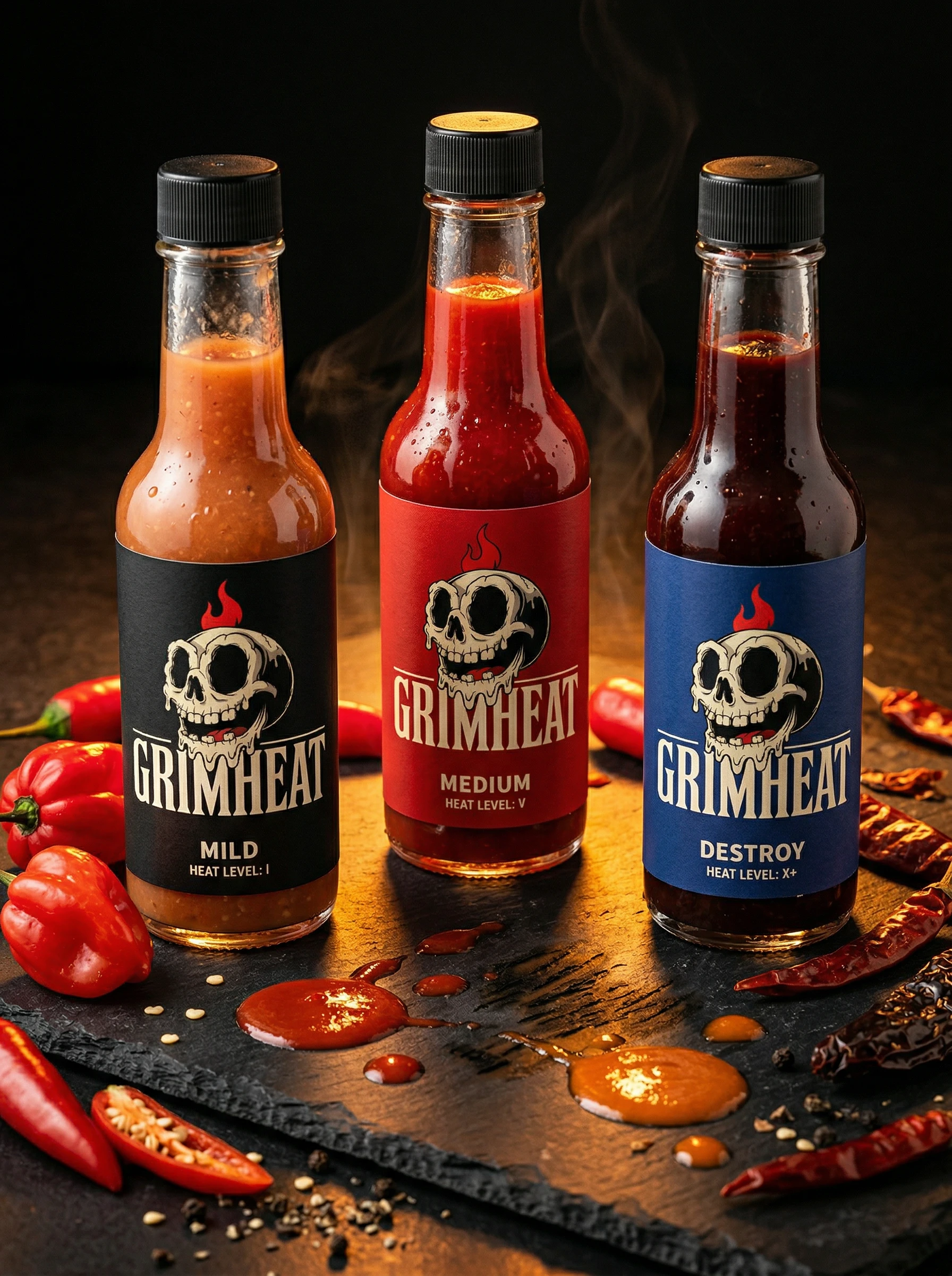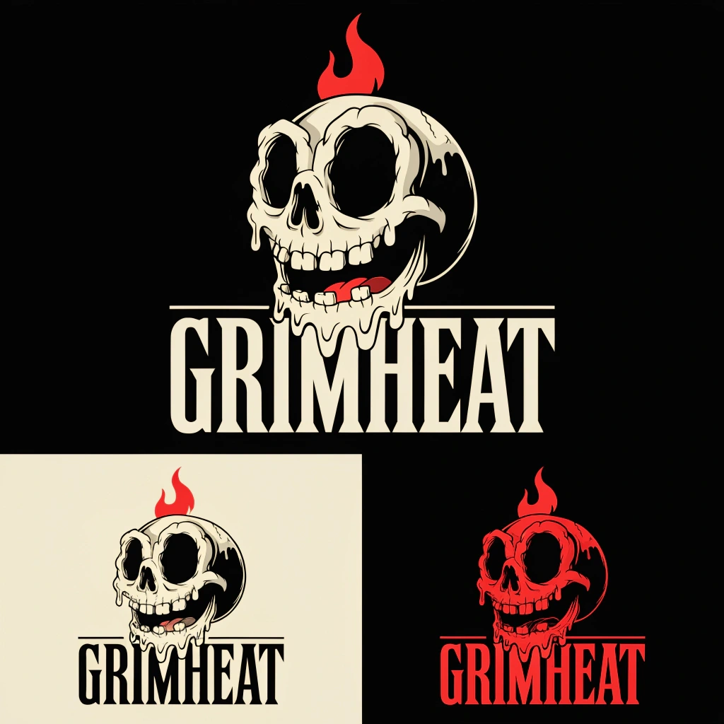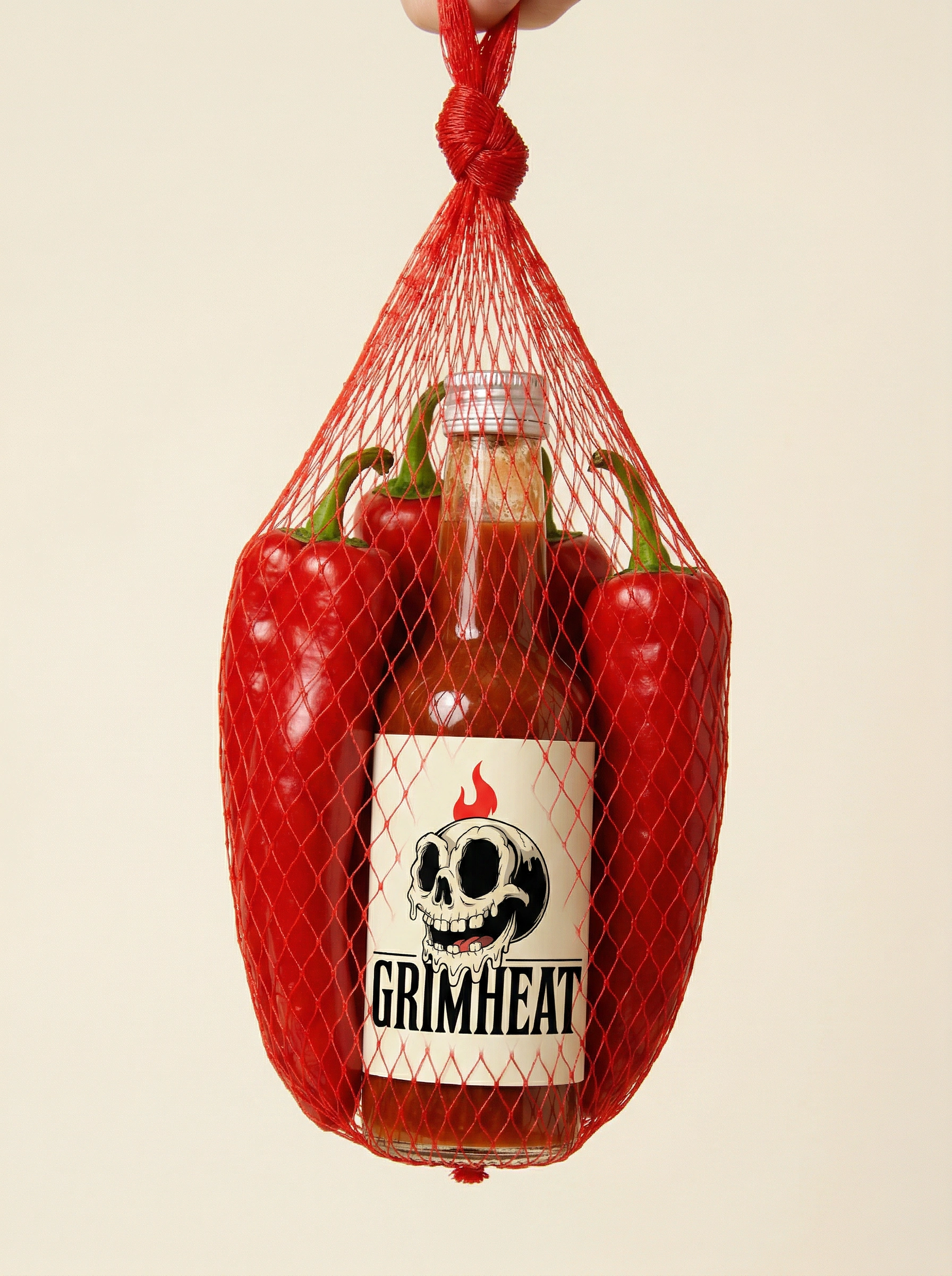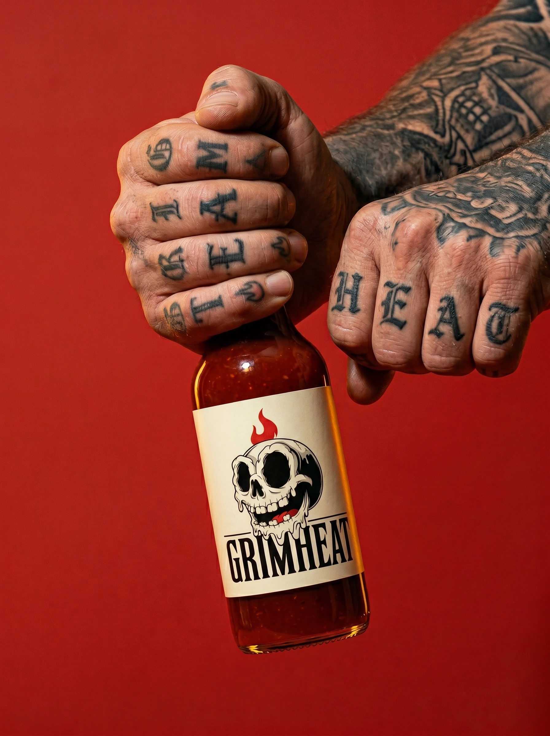 GRIMHEAT: a hot sauce brand built on cartoon-grotesque DNA. Identity system + 20 campaign mockups across three visual worlds.