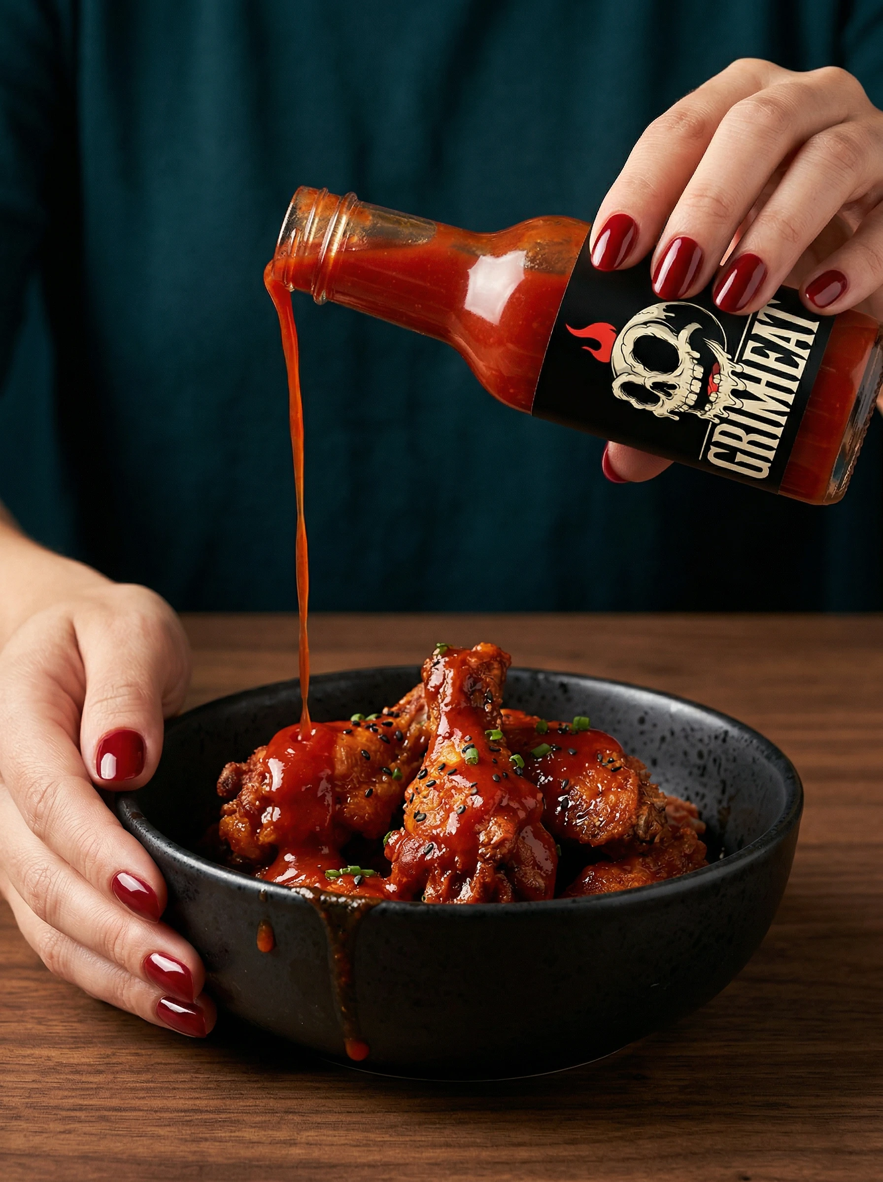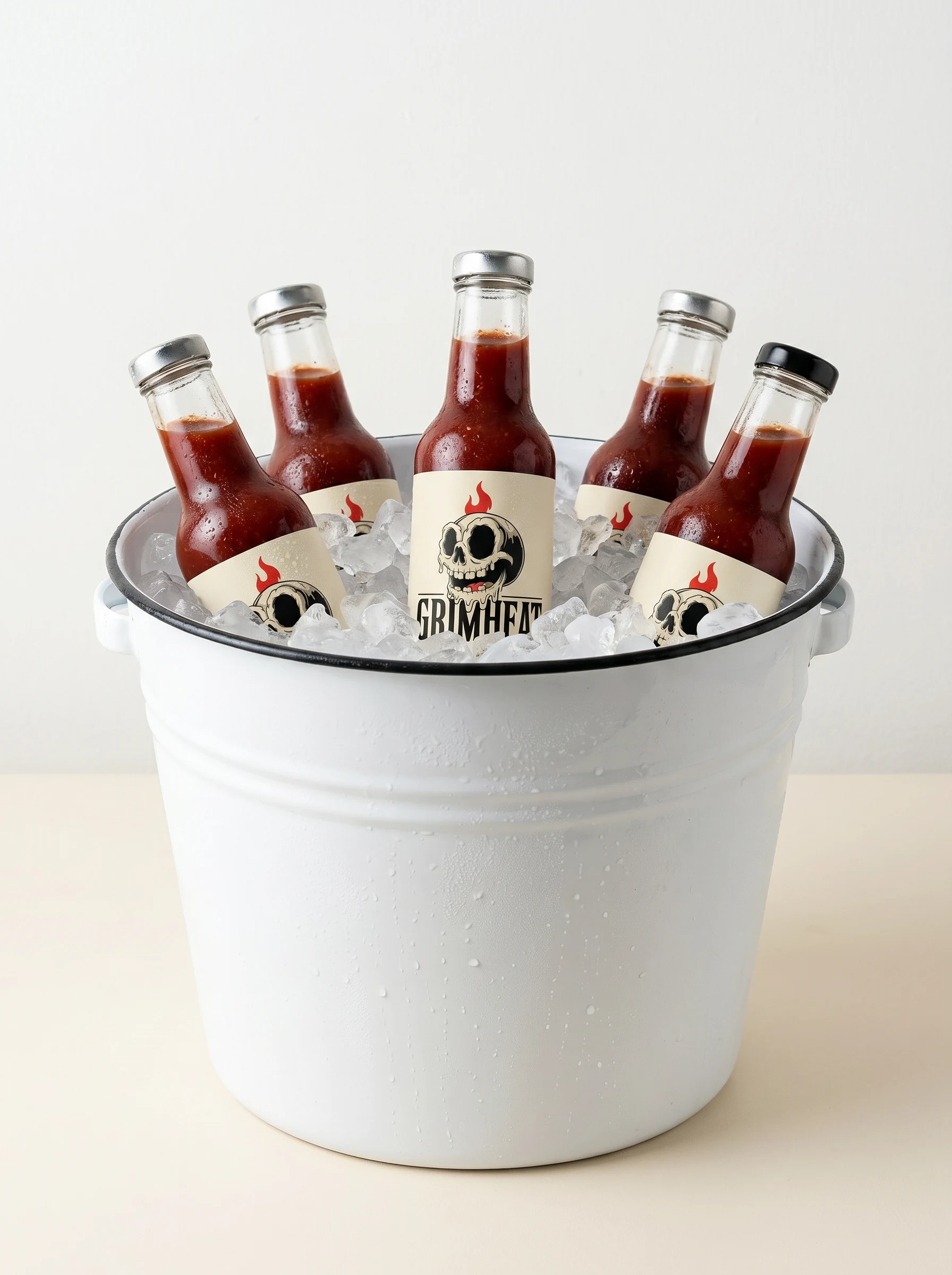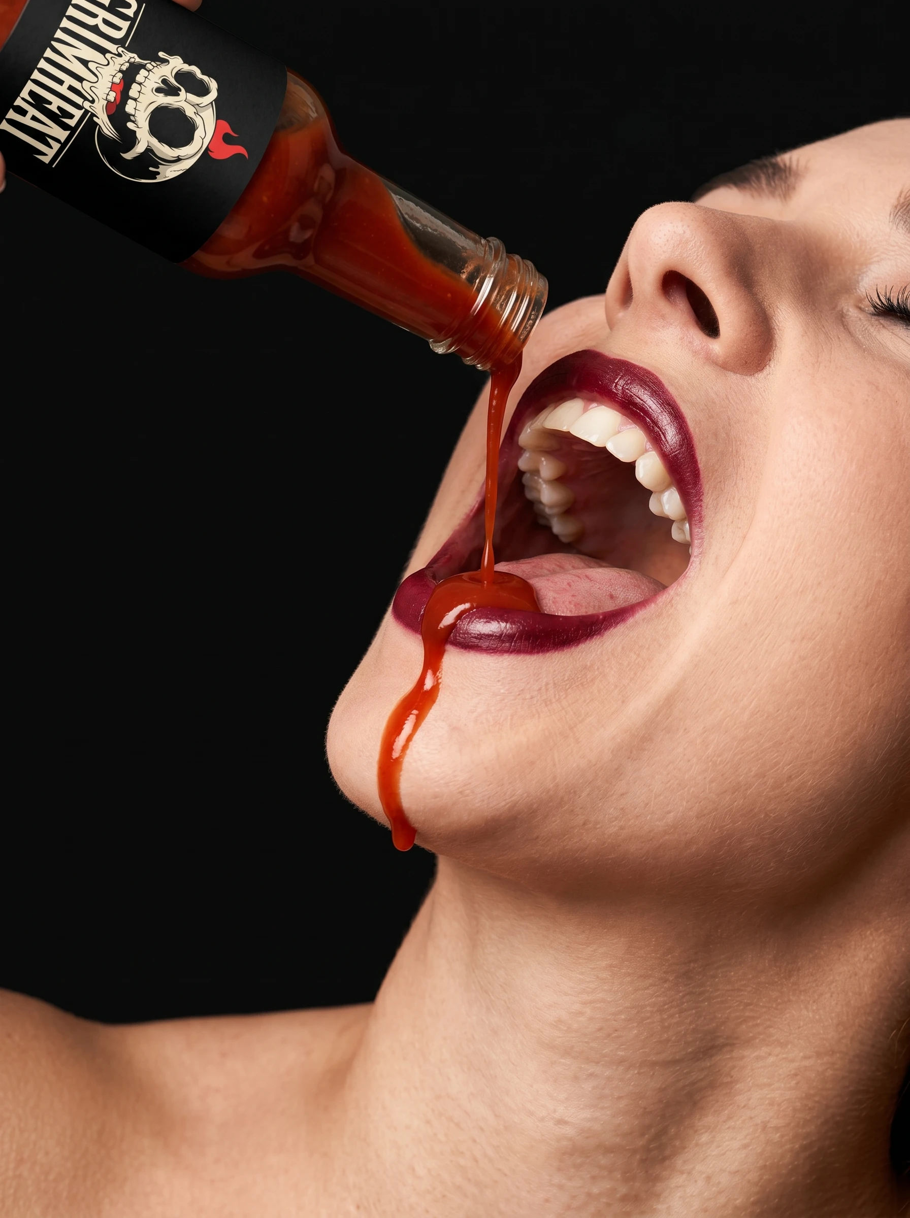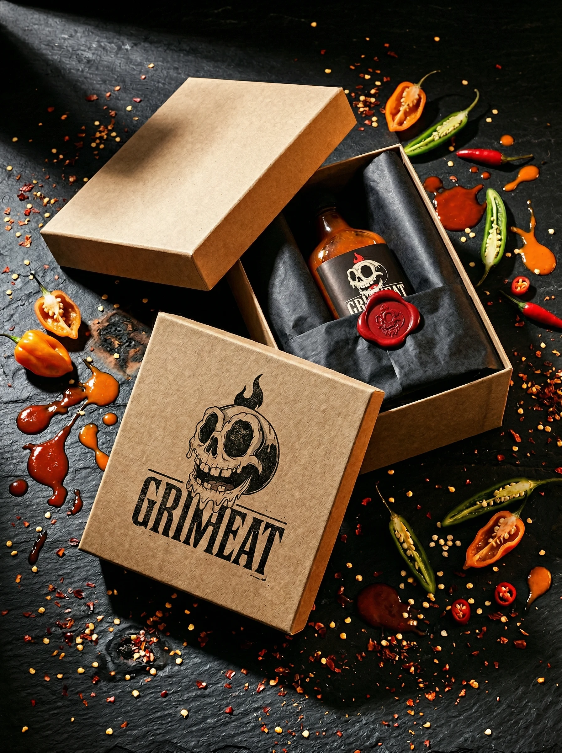 GRIMHEAT: a hot sauce brand built on cartoon-grotesque DNA. Identity system + 20 campaign mockups across three visual worlds.