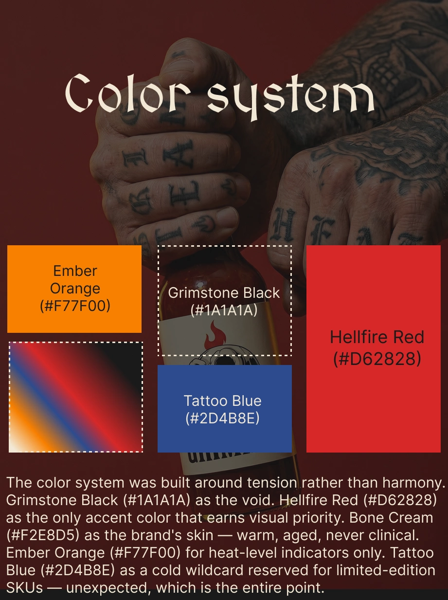 #1A1A1A) as the void the character lives in. Hellfire Red (#D62828) as the only accent that earns attention. Bone Cream (#F2E8D5) as the skin of the brand — aged, warm, never pure white. Ember Orange (#F77F00) reserved for heat indicators. Tattoo Blue (#2D4B8E) as a cold wildcard for limited SKUs, unexpected enough to feel intentional.
