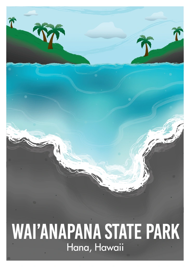 Created entirely in free-hand digital illustration, the goal was to capture the beauty and contrast between the bright blue waters and the black-sand beach.