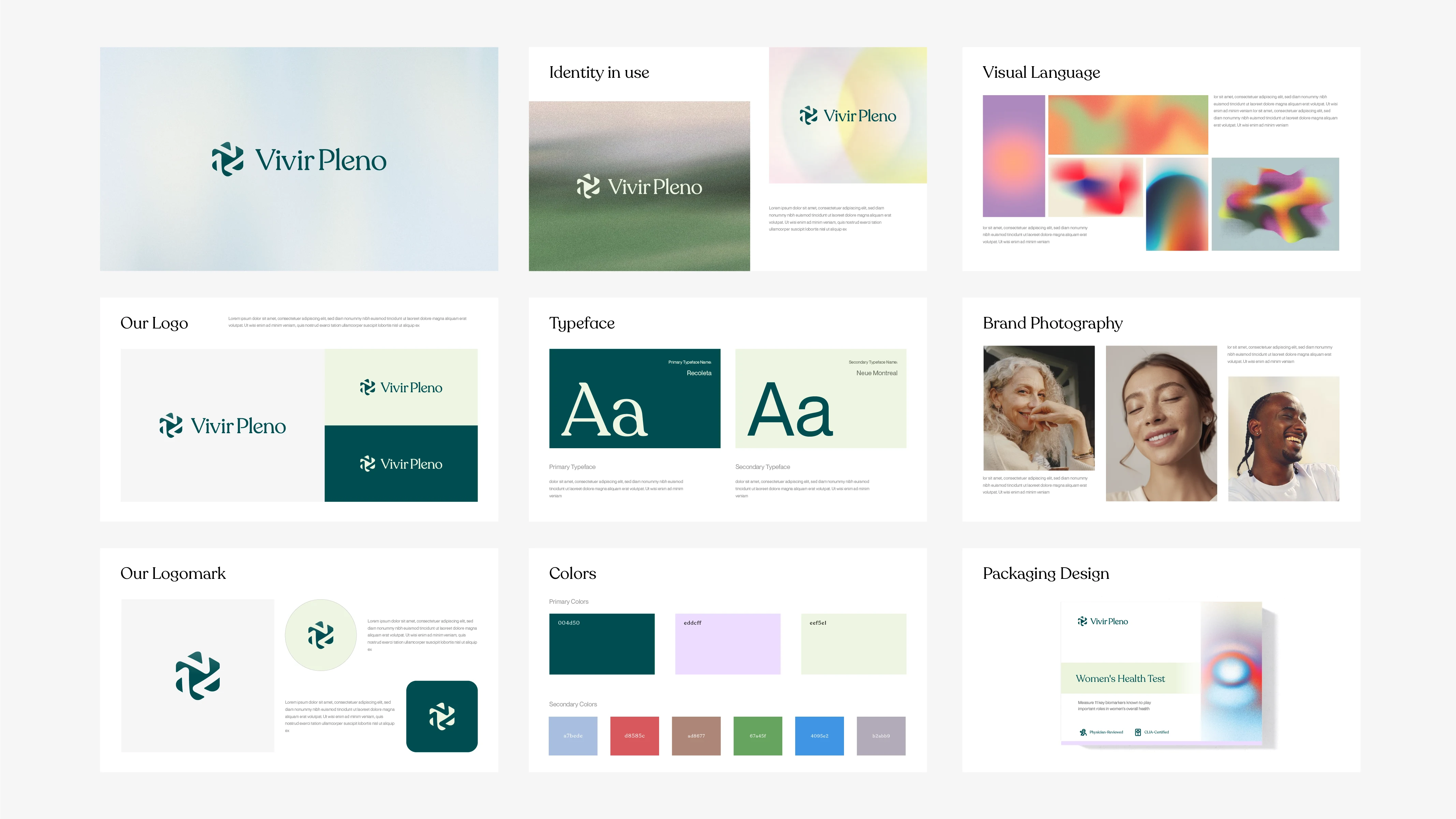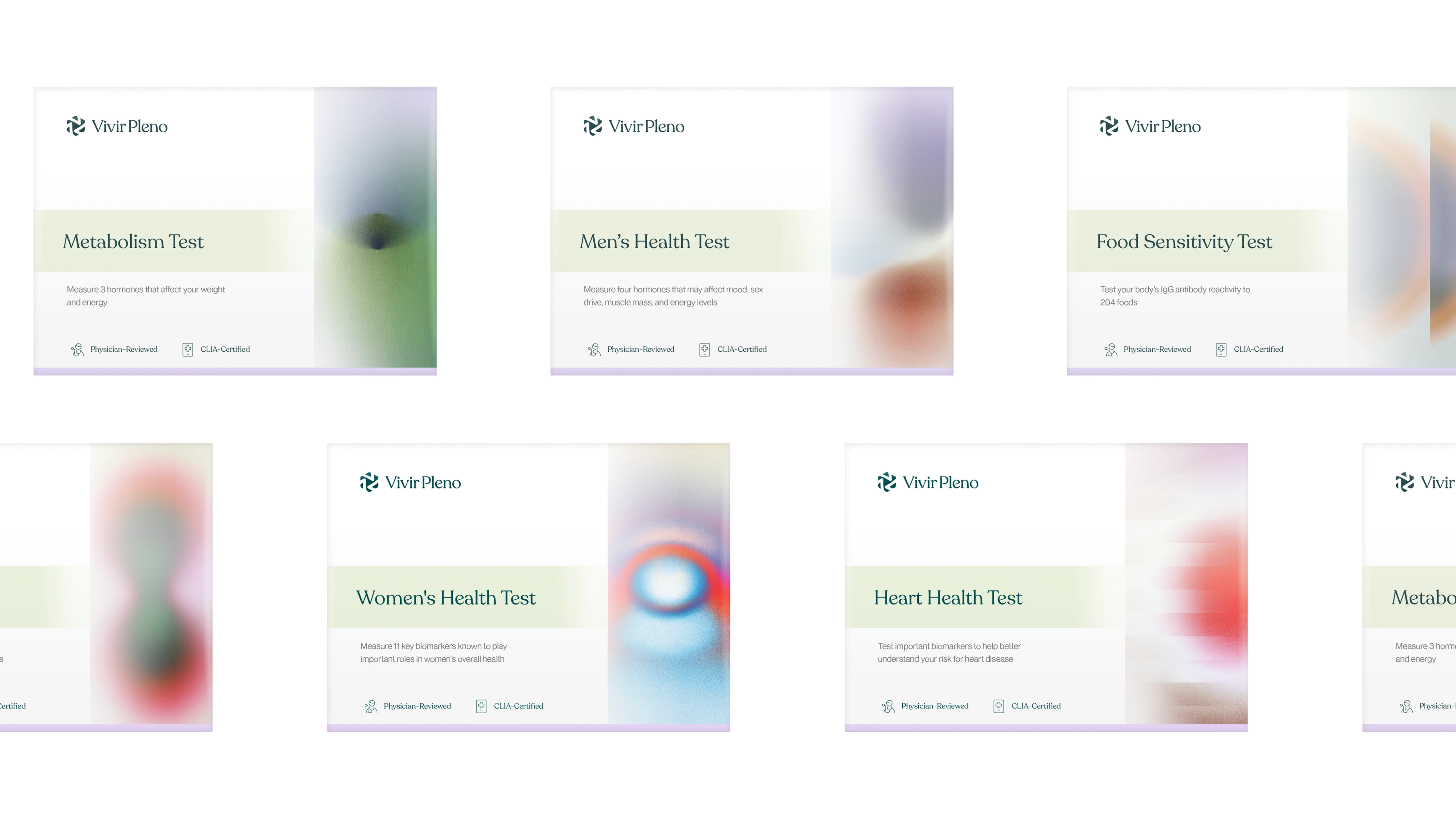 Vivir Pleno offers easy at-home health tests with secure results from certified labs. We designed a minimal, spacious identity with soft tonal gradients.