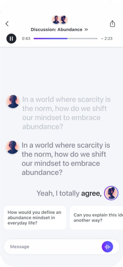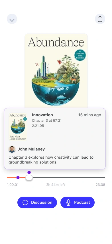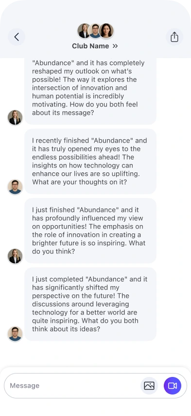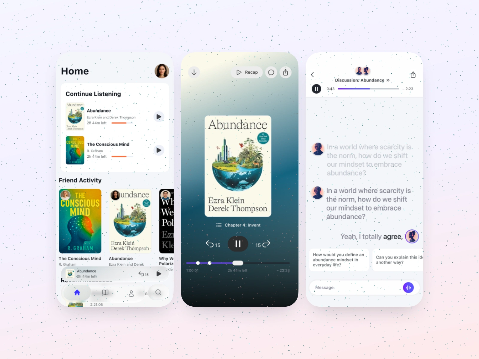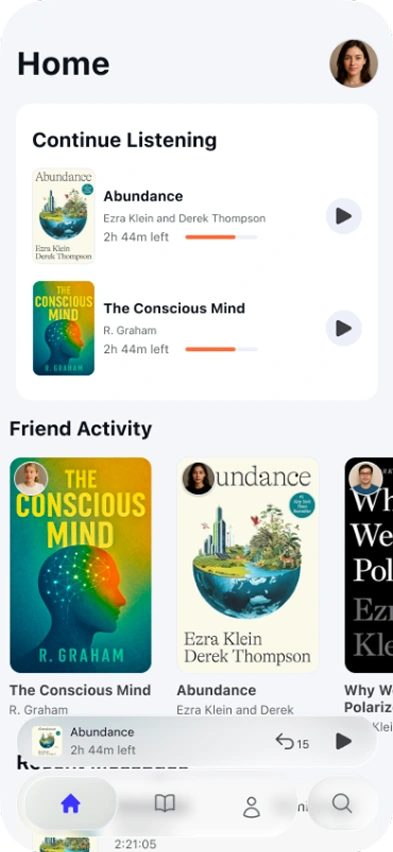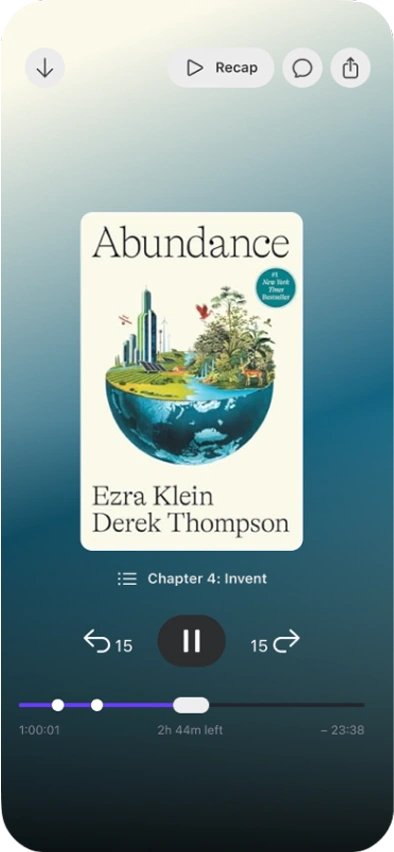 Audiobook app concept blending playback, social chats, and interactive AI driven recaps to make listening more engaging and collaborative.