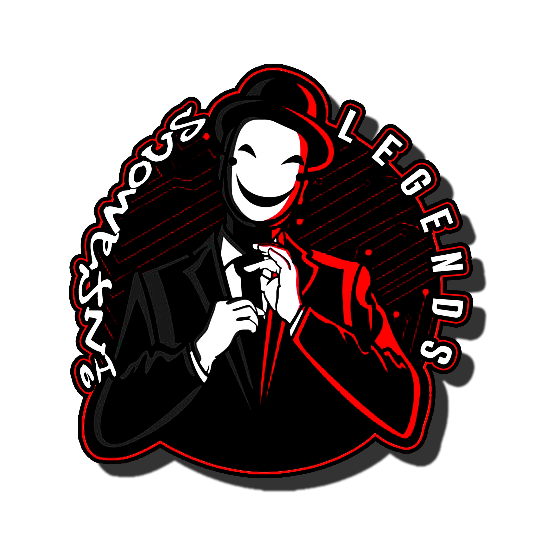 INFAMOUS LEGENDS logo shows a suited figure with a bold red-black theme, symbolizing confidence, unity, and dominance—perfect for a fierce Dota 2 team identity.