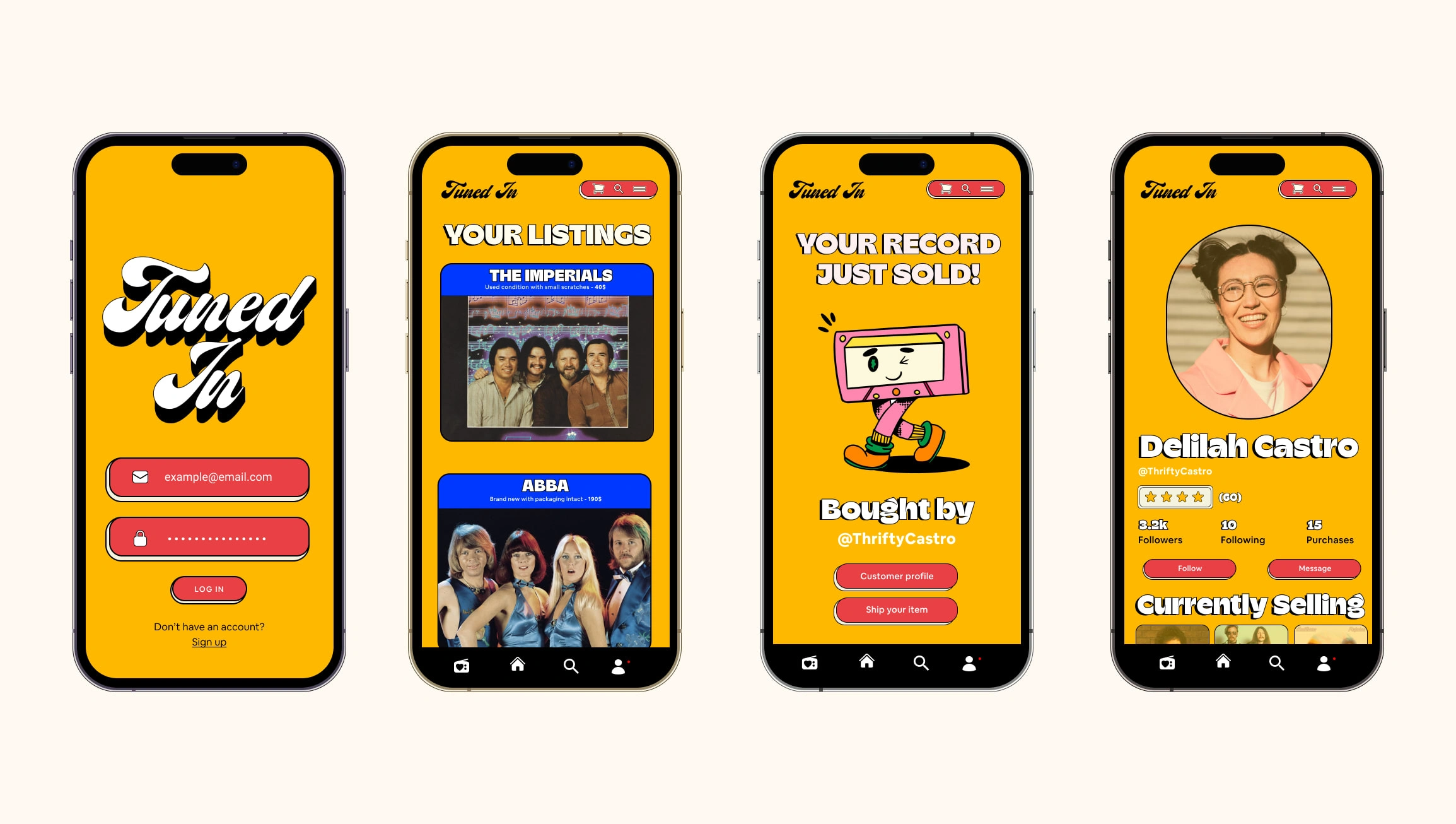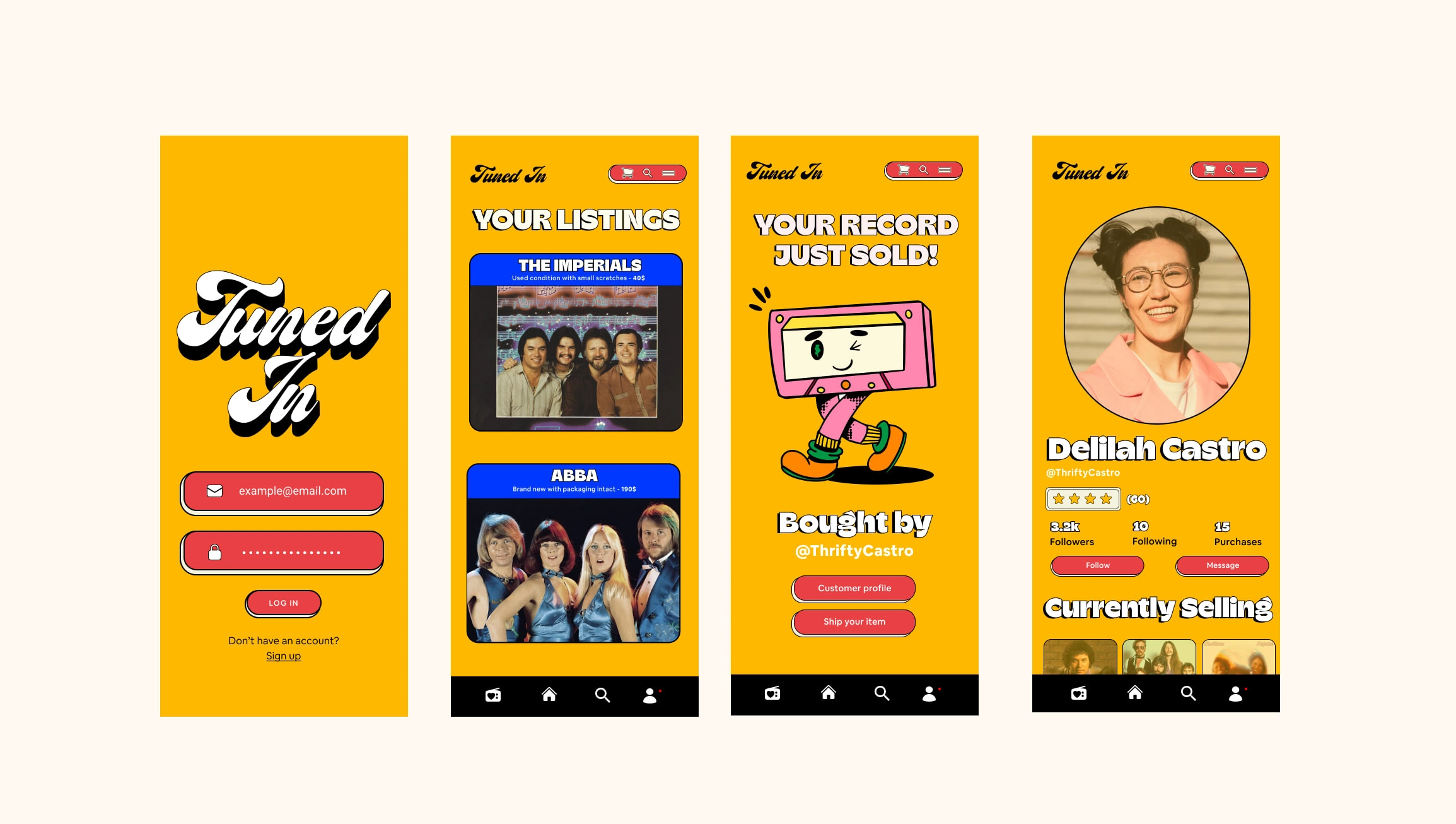 Fun retro 90's style design for a record-collecting app! Original illustrations made in Procreate and functional frames made in Figma.