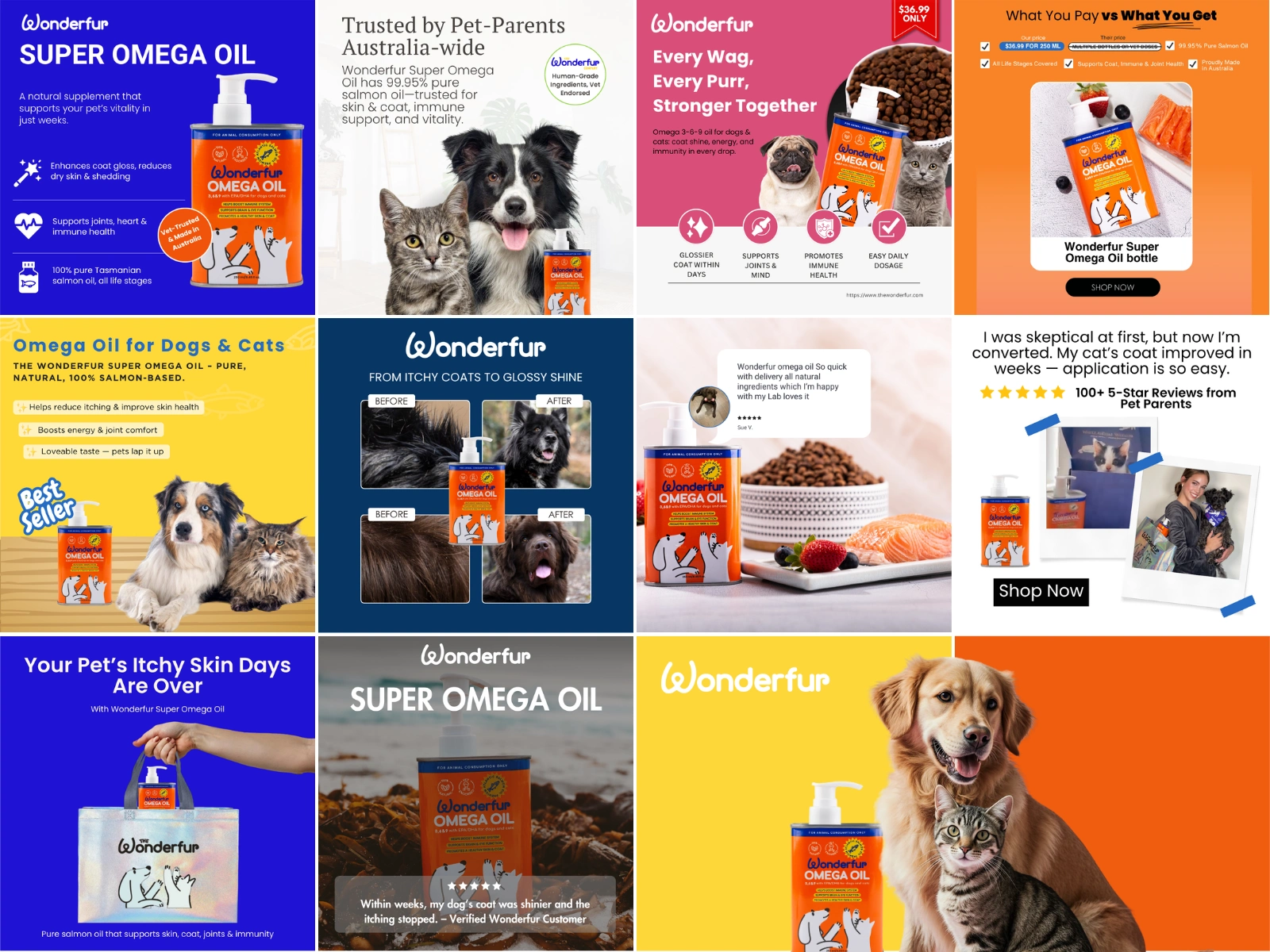 Designed 10 unique digital ads for Wonderfur Salmon Oil, leveraging the "Visible Difference" concept to maximize trial and promote superior pet coat health.