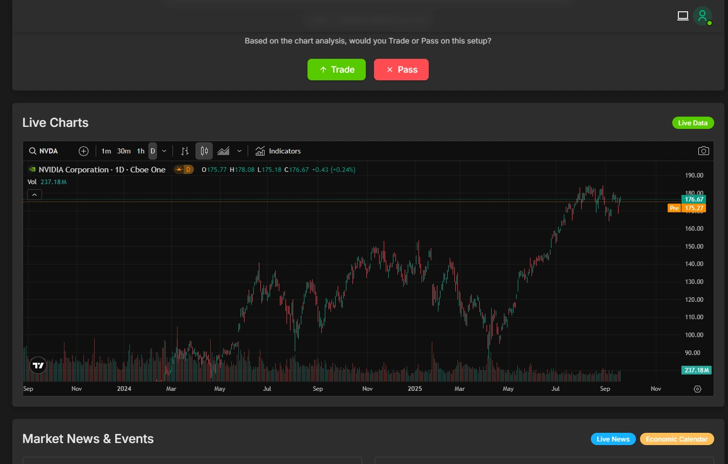 Integrated with MT5 to stream live forex market data for realistic trading practice.