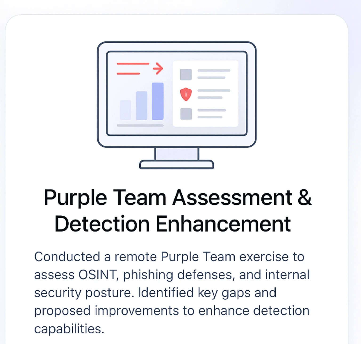 Led a remote Purple Team assessment using OSINT, phishing, and internal tests to identify detection gaps in credential use, phishing response, and TTPs.