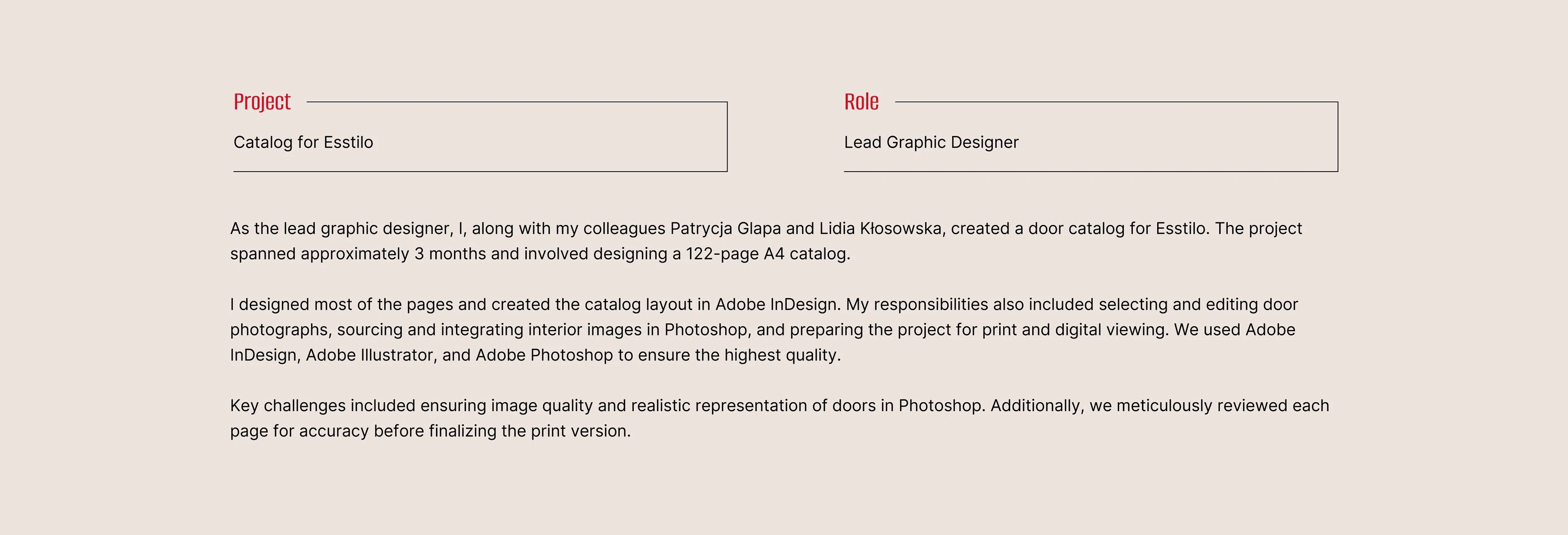 As the lead graphic designer, I, along with my colleagues Patrycja Glapa and Lidia Kłosowska, created a door catalog for Esstilo. The project spanned approxima…