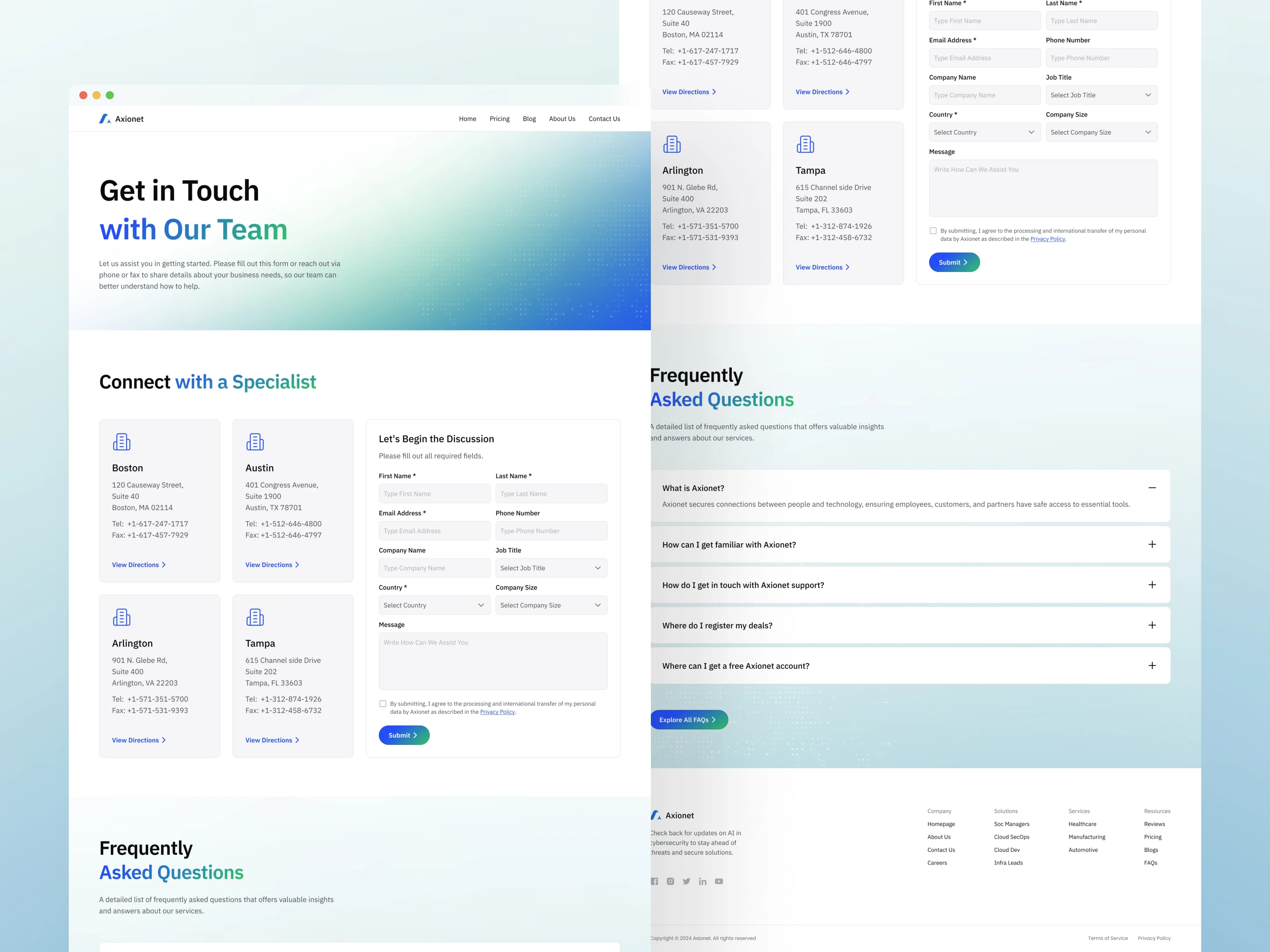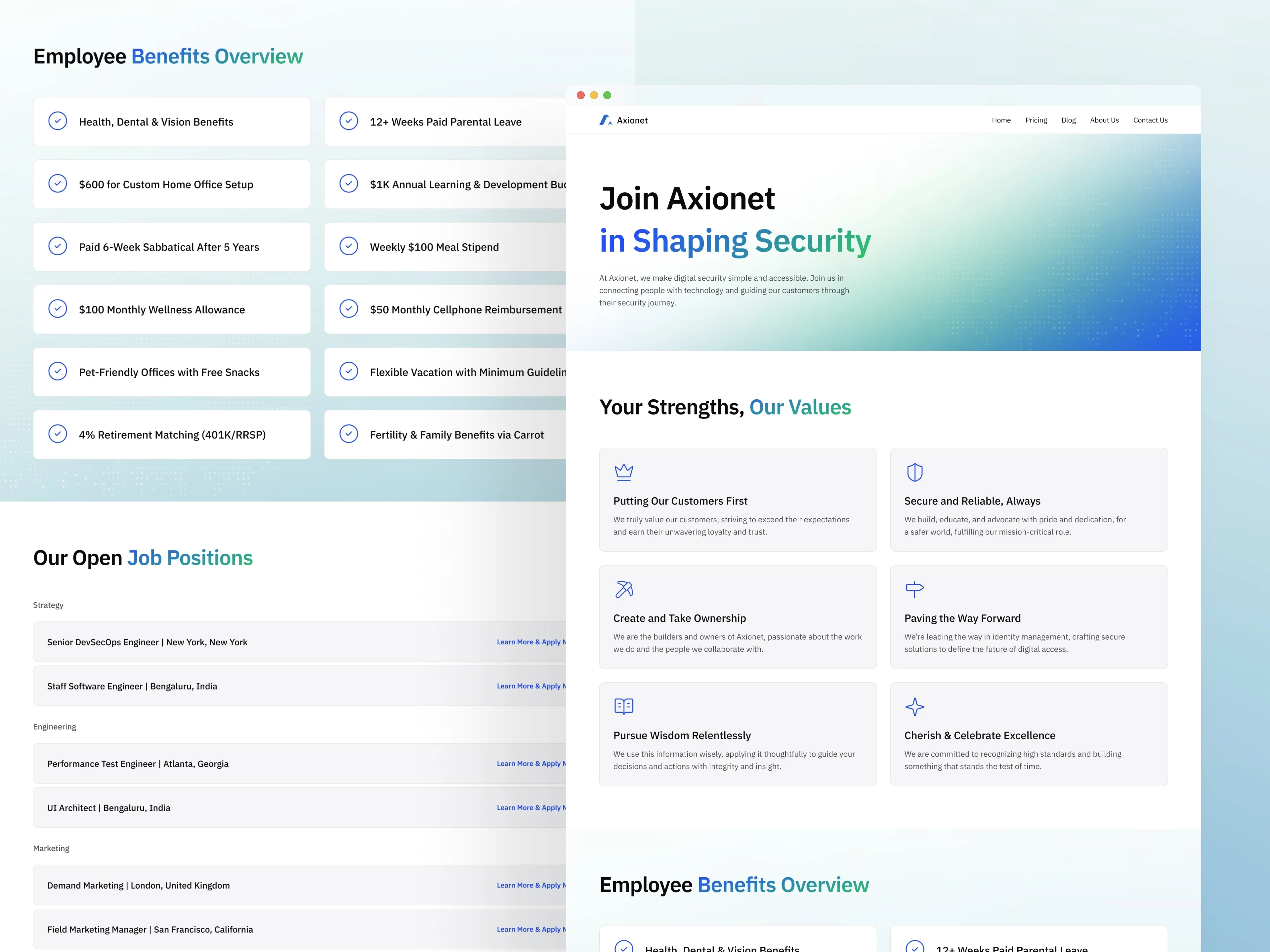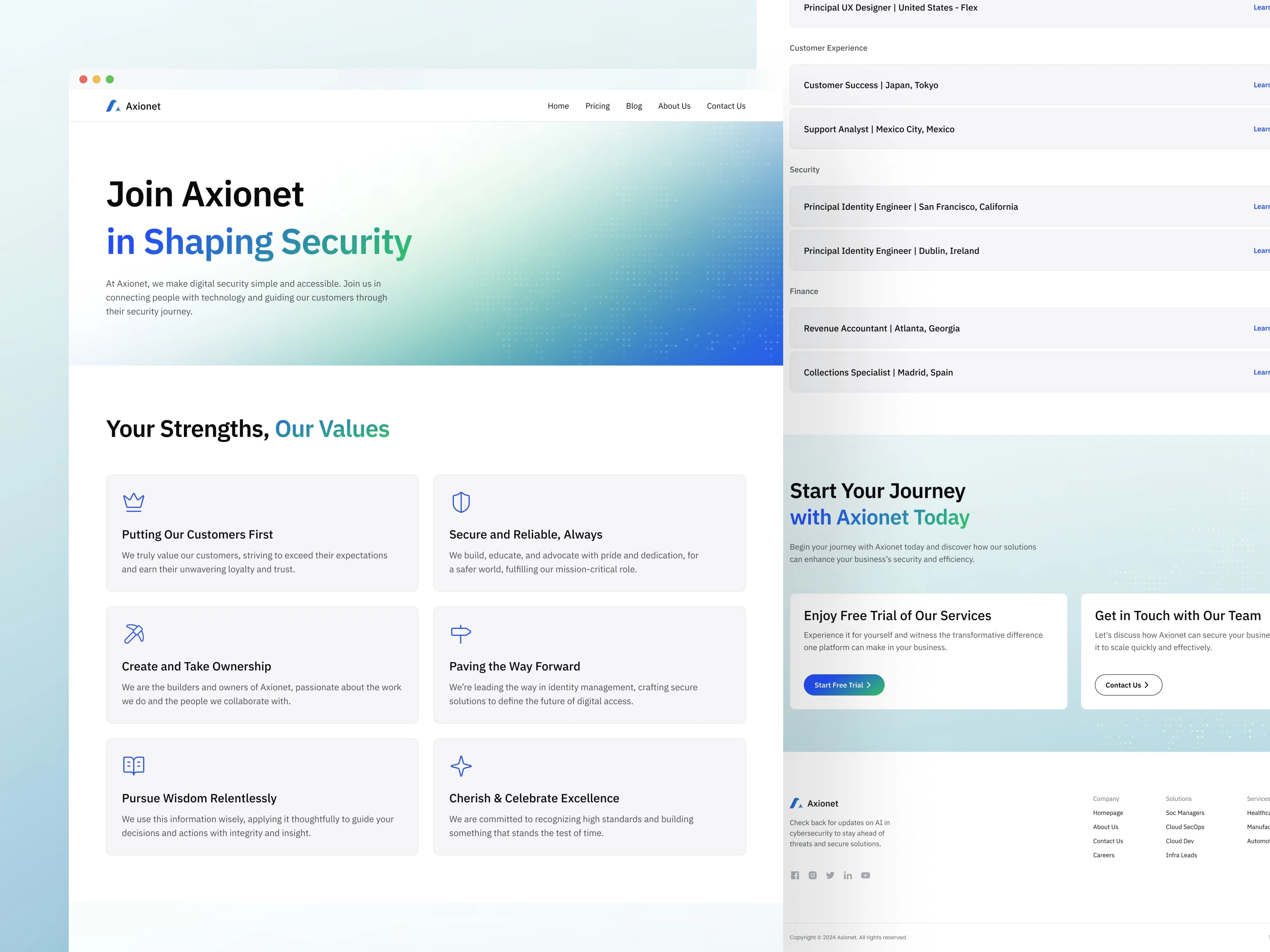 Axionet launched with 11 complete pages: Home featuring hero sections with security-focused CTAs and threat intelligence displays, About showcasing company mission and security expertise, Careers with culture and open positions, Pricing with flexible security packages, Blog and Blog Single for thought leadership, FAQ addressing common security concerns, Contact with multiple touchpoints.