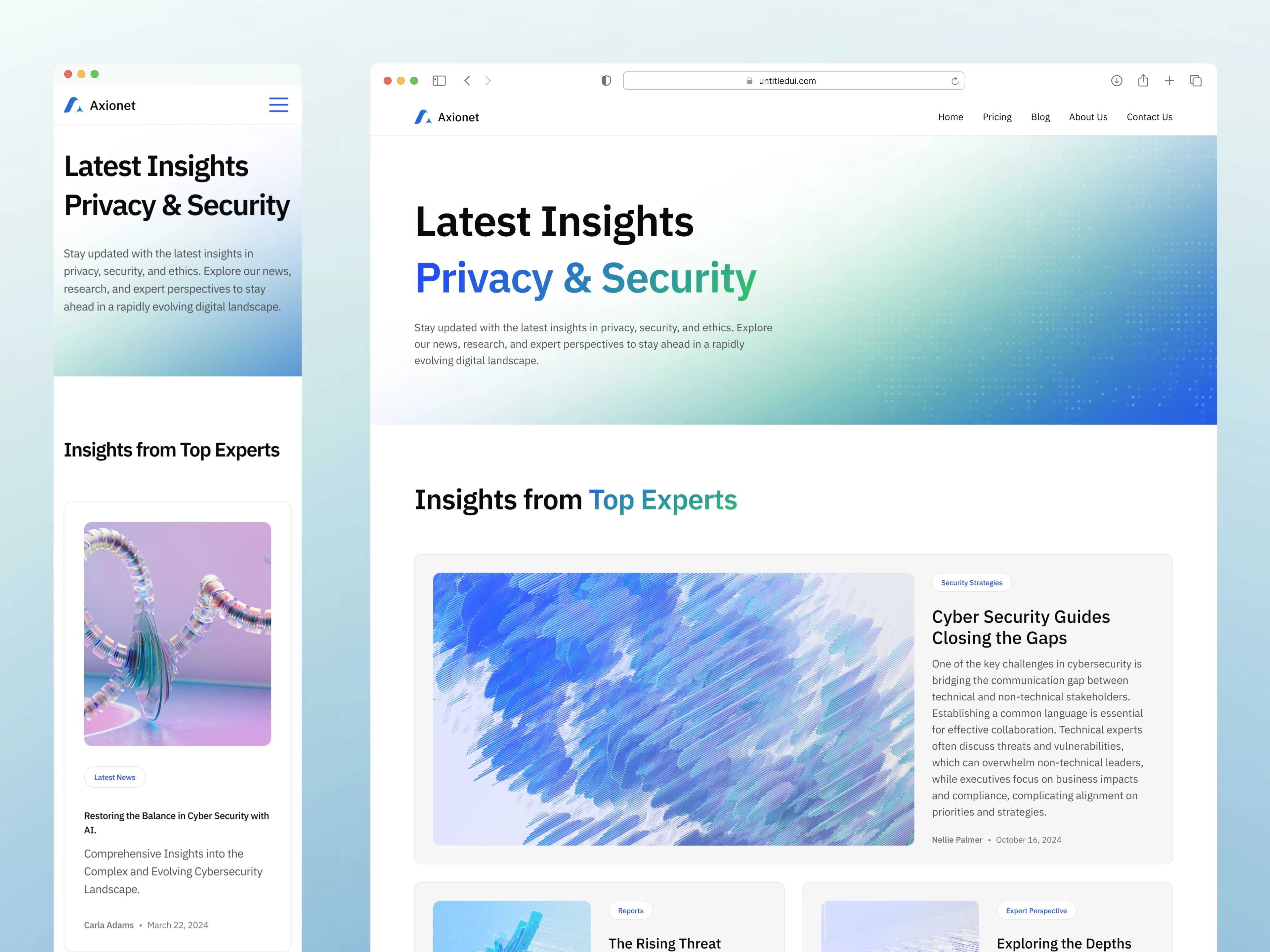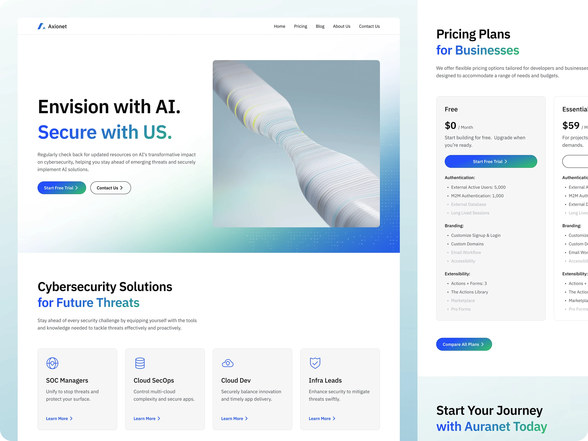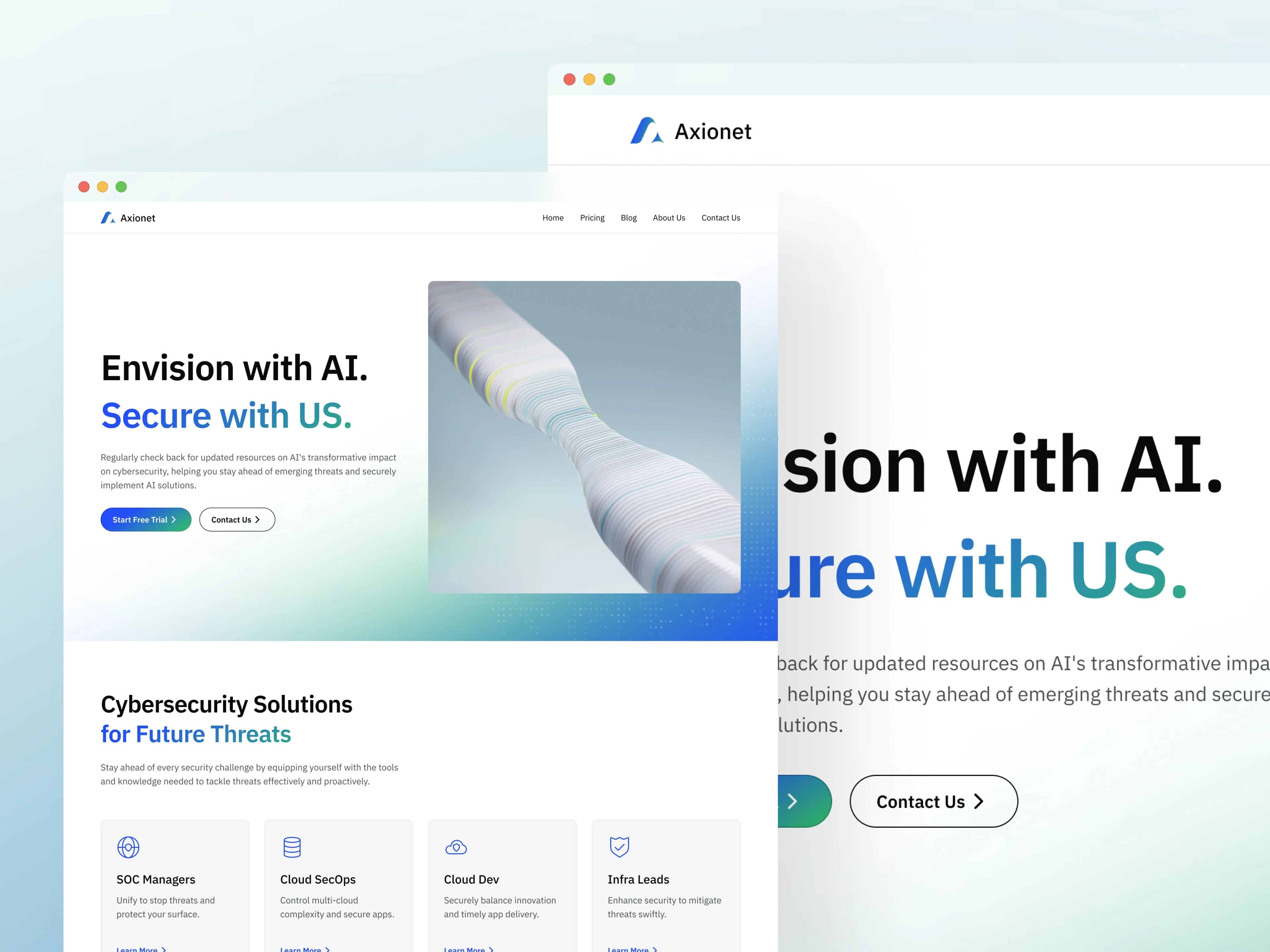 Axionet is a comprehensive AI cybersecurity startup template designed to help security firms establish a strong digital presence quickly. The template includes 11 pre-built pages, 100+ sections, and 50+ component variants tailored specifically for AI-driven security companies, consultants, and tech firms needing to showcase expertise and build trust.