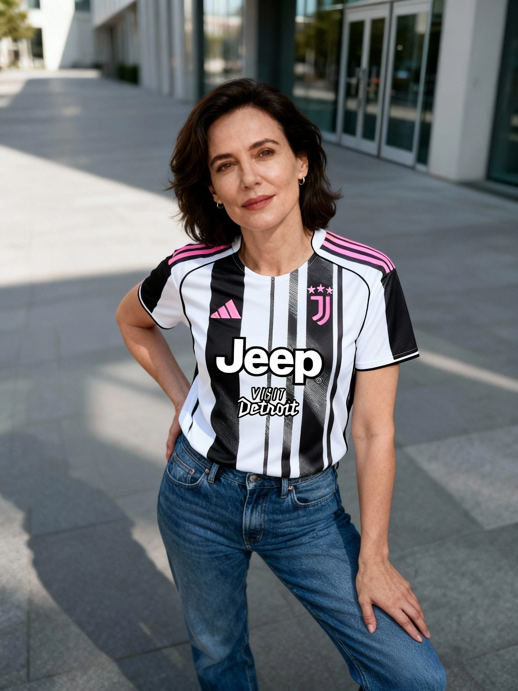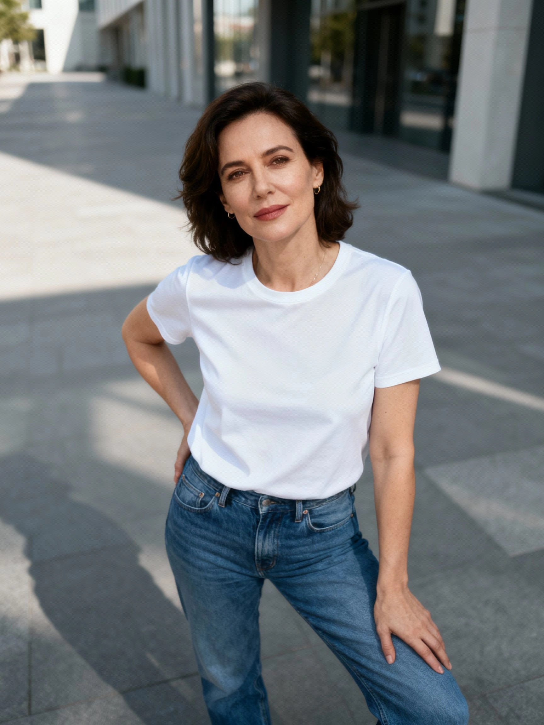 "Cinematic street-style fashion video of a woman walking confidently along a modern city street, her long wavy hair catching the summer breeze. Sunlight reflects off the building glass as she walks, camera tracking from a low angle with shallow depth of field.""High-angle editorial fashion photo of a Caucasian brunette woman in her 30s wearing a classic white T-shirt and blue jeans" with the instruction "only swap the t-shirt for the second image."