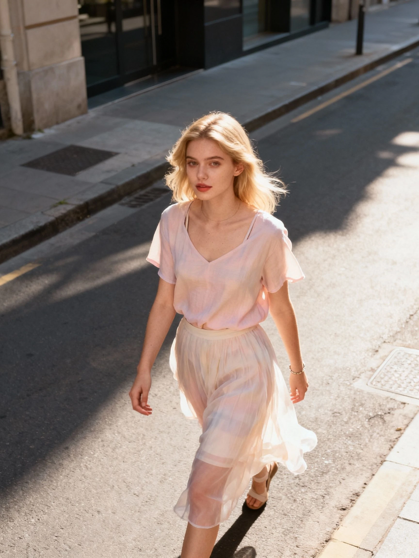 "High-angle editorial street-style photo of a young blonde woman in her 20s walking along a city street. She wears light, flowy summer clothing — a pastel-toned top and airy skirt — with minimal accessories and natural makeup. Shot from above in warm natural sunlight with soft shadows, featuring a modern urban backdrop."
