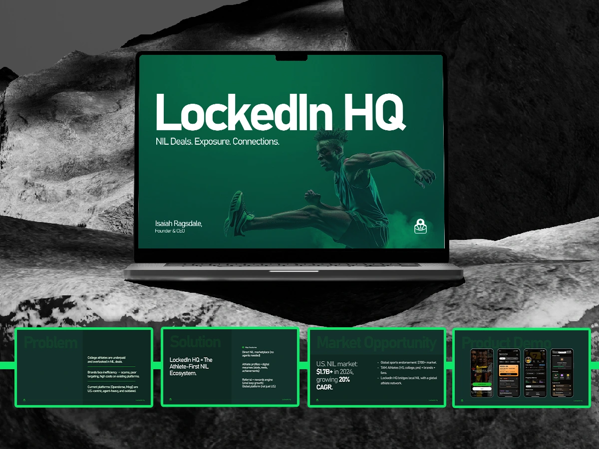 I designed the investor pitch deck for LockedIn HQ, an athlete-first NIL platform tackling inefficiencies in the $1.7B+ NIL market.