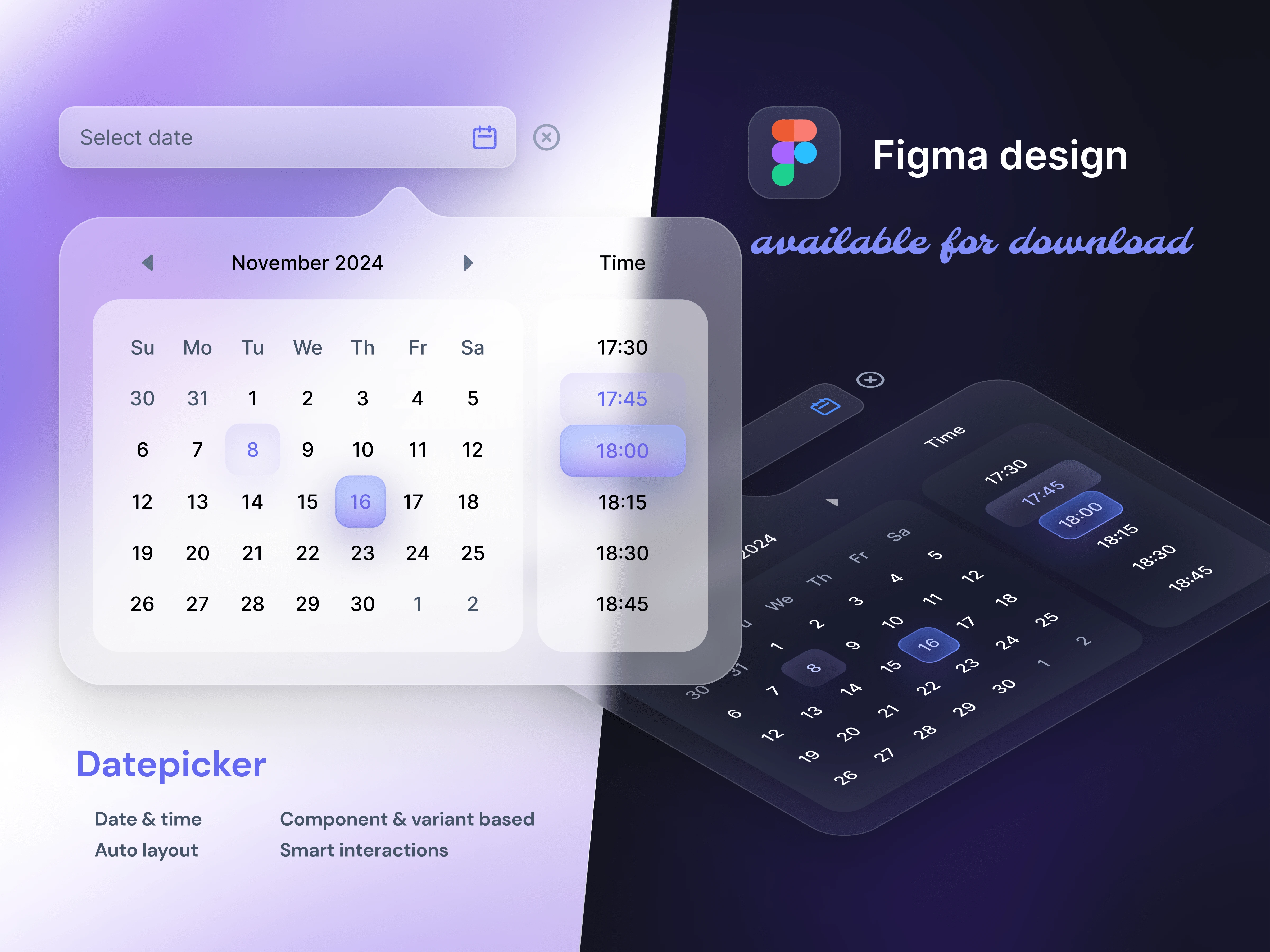 Glassmorphic datepicker UI with light and dark modes. Built with smart Figma interactions and auto layout for seamless, modern date & time selection.