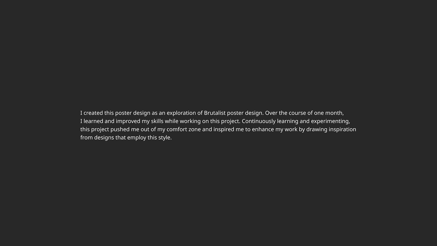 This poster explores Brutalist design, pushing me to refine my skills and step out of my comfort zone through experimentation and learning.
