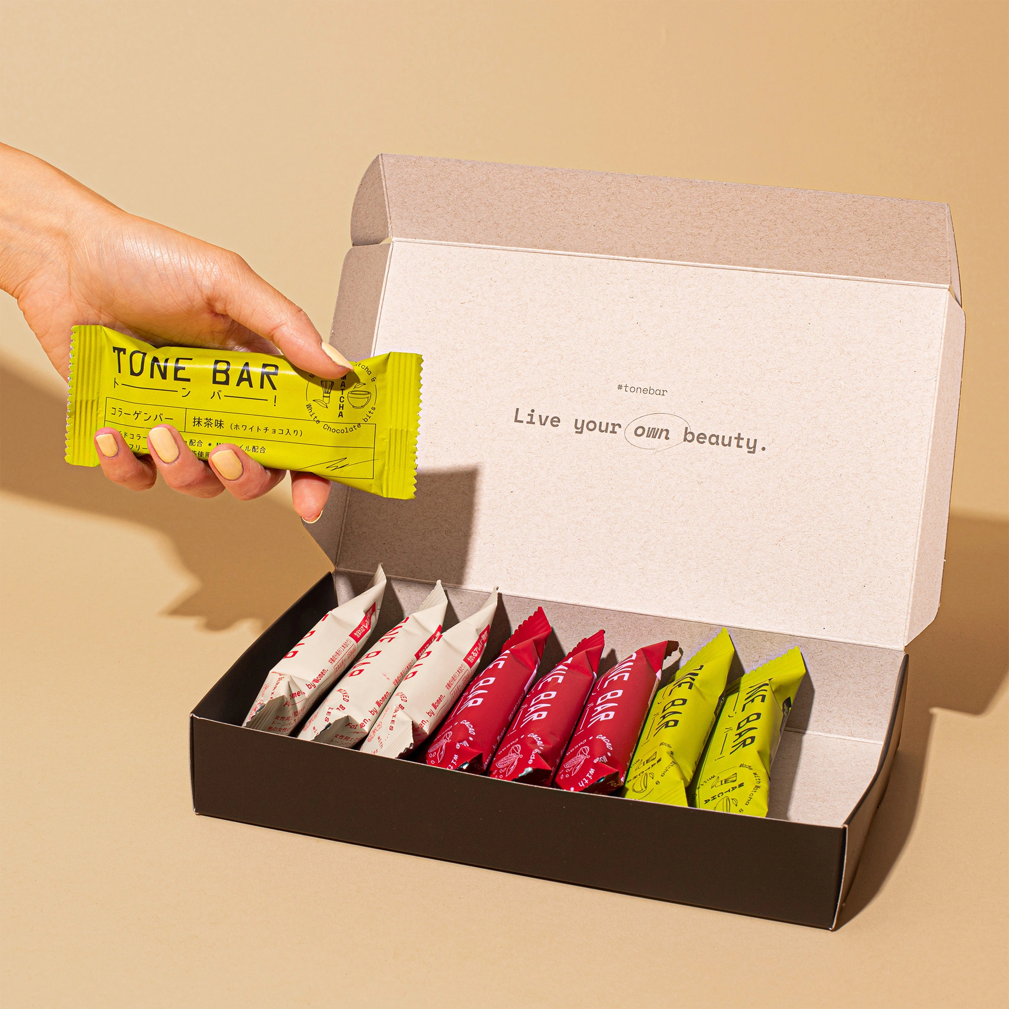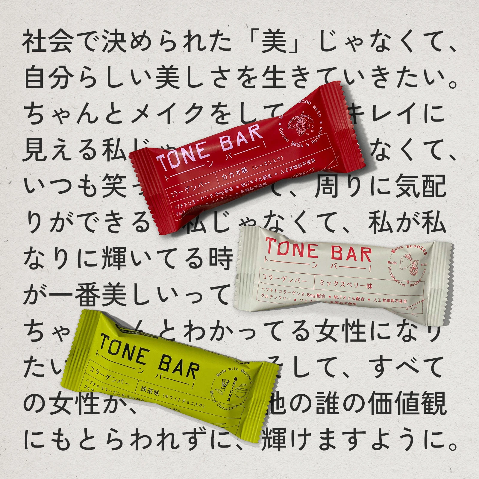 TONE BAR is a gluten-free collagen bar that satisfies the stomachs, minds, and beauty needs of busy women in Japan.