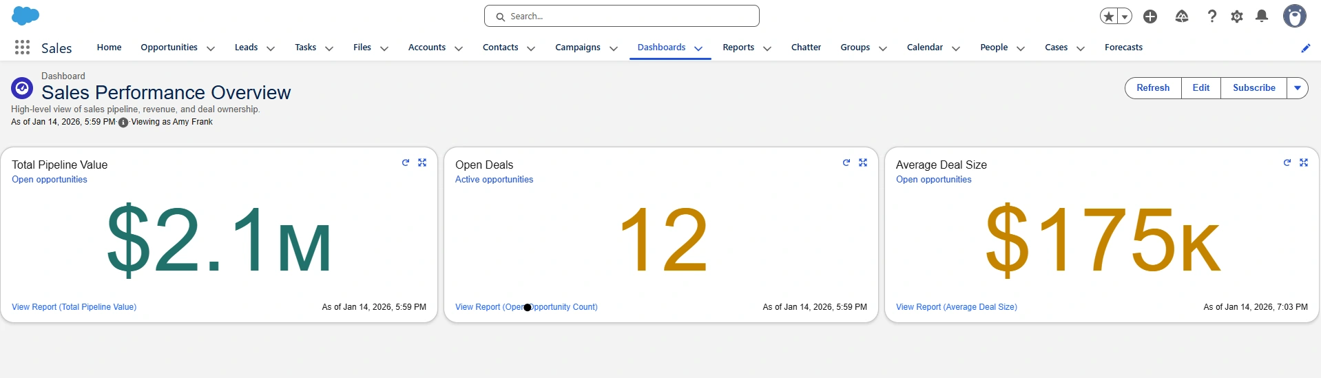 This Salesforce setup was designed to create a clean, consistent system for tracking deals and turning that activity into clear, real-time reporting.