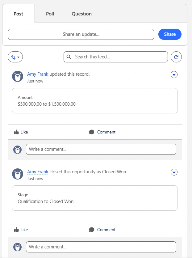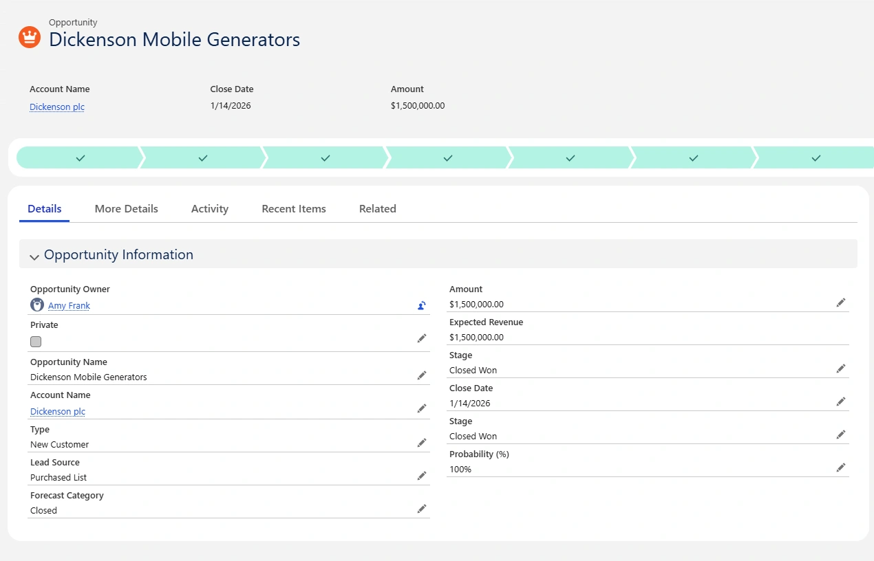 Every important change to an opportunity is logged automatically. This creates transparency and allows sales leaders to see when deals were updated or closed.