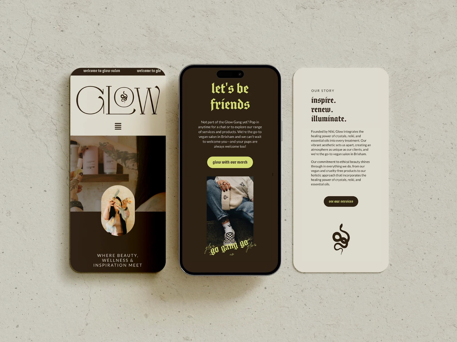 Instead of creating a desktop site and shrinking it down, I designed Glow’s entire digital experience mobile-first - meaning every layout, interaction, and piece of content was built to shine on handheld devices. The result is a seamless, on-the-go experience where clients can browse services, shop merch, and book appointments effortlessly, no pinching, zooming, or hunting required. This approach not only reflects how real clients interact with Glow, but dramatically improves accessibility, usability, and conversion.
