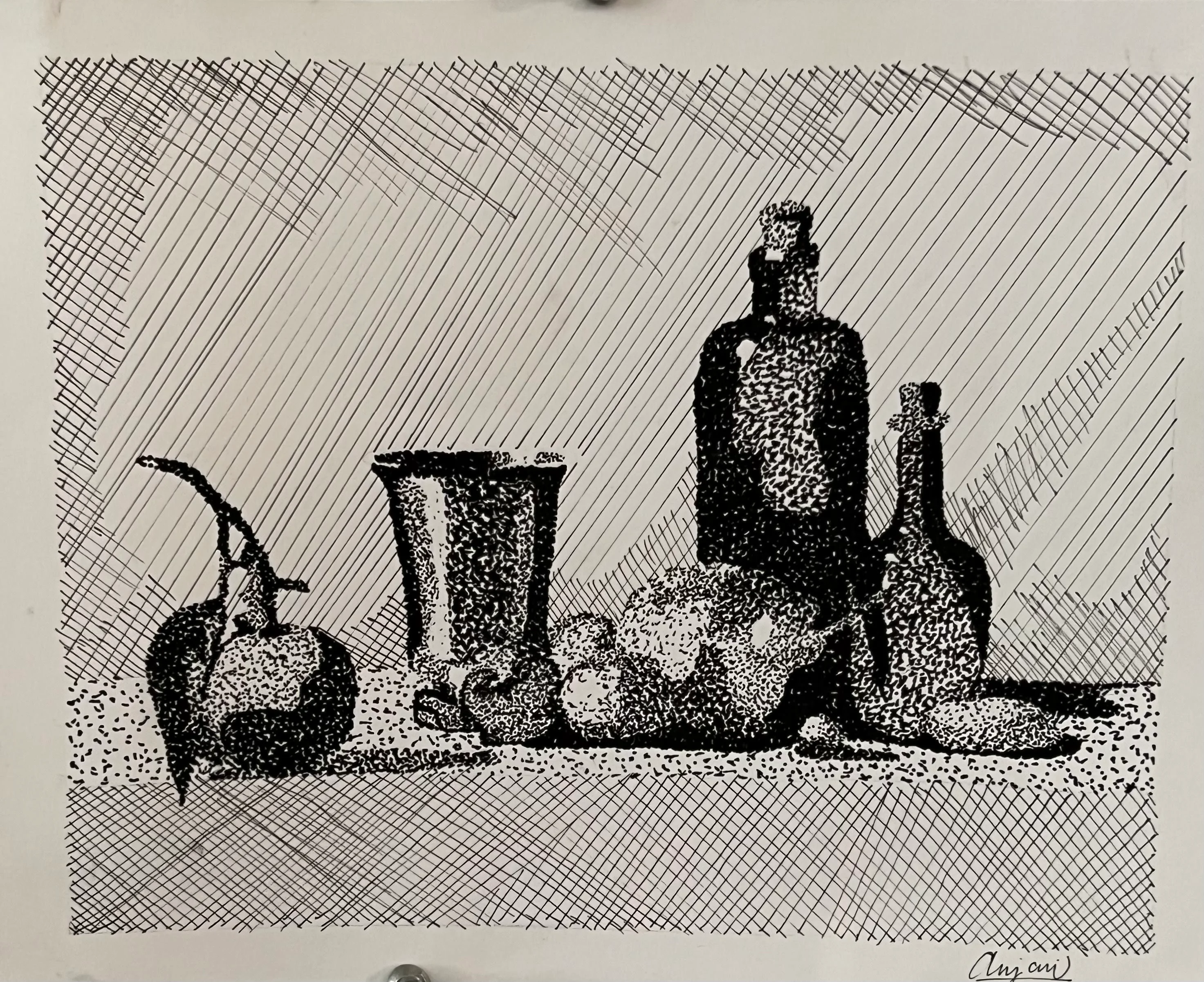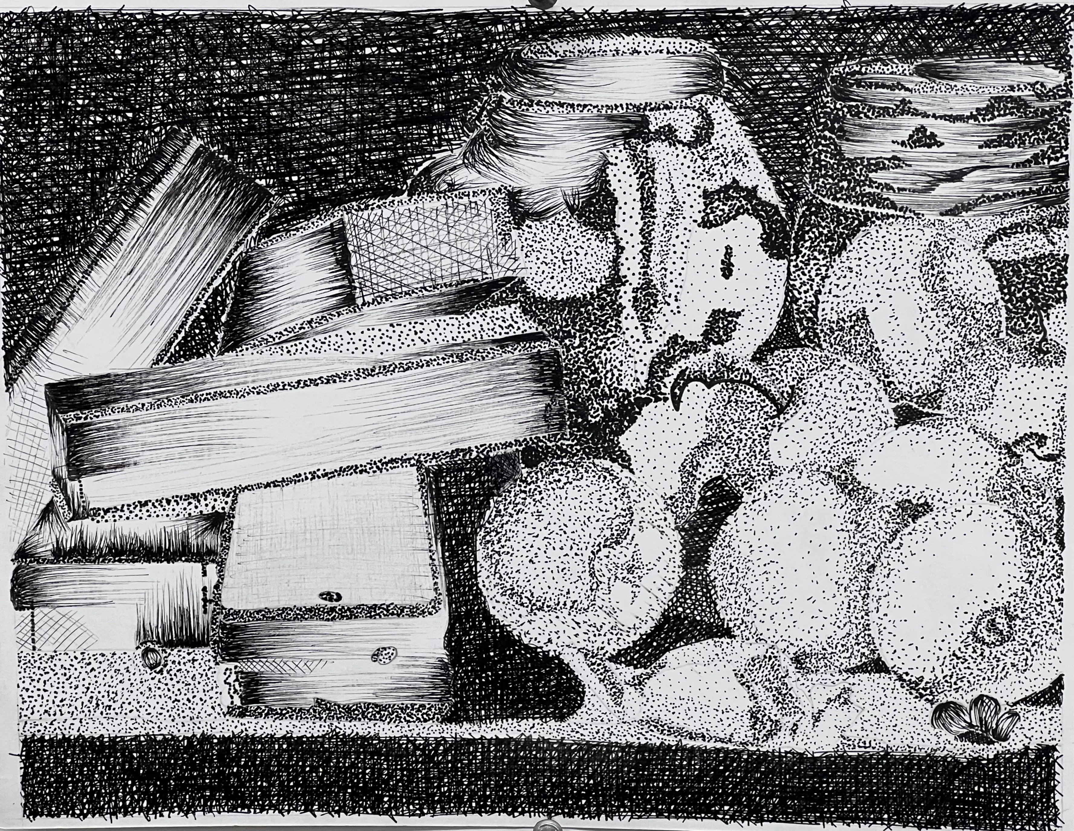 Exploring the techniques of Stippling and Crosshatching in my Draw 100 class using Pigma Microns only in black. These sketches allowed me to develop a sense of volume and how to communicate depth and perspective through a 2D design.