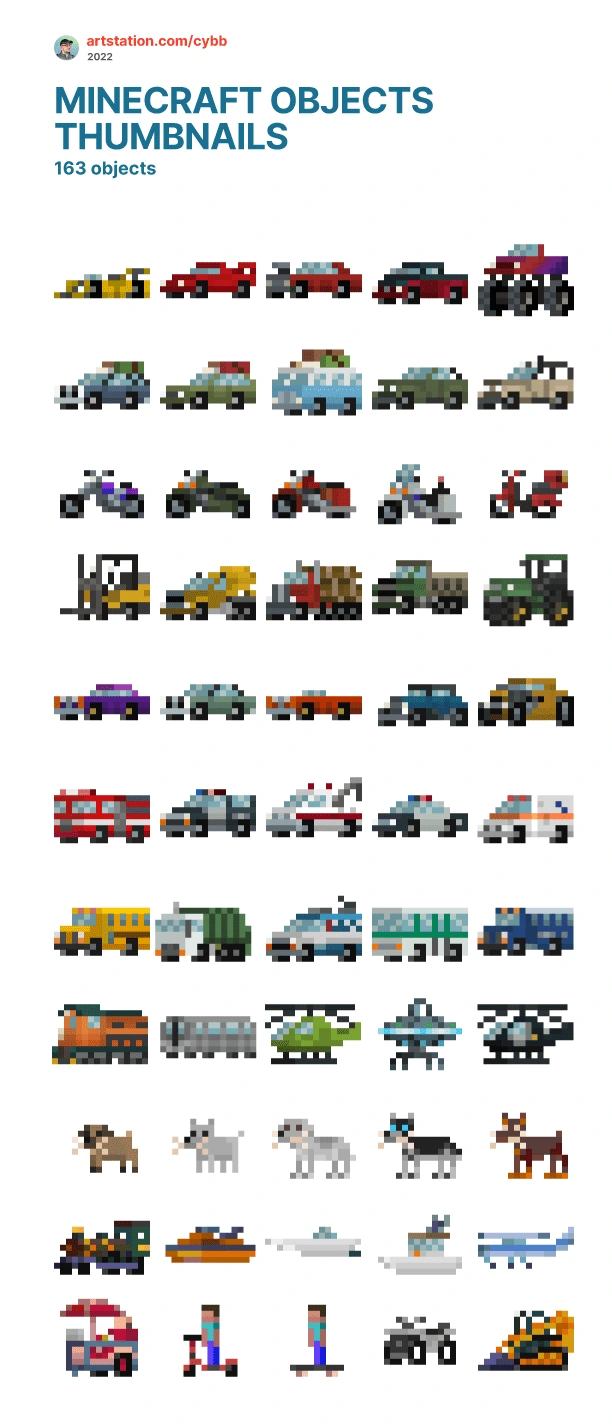 Minecraft objects thumbnails for Minecraft mod - 163 items. Adding transport, characters, and furniture to the game, adding more fun to play!