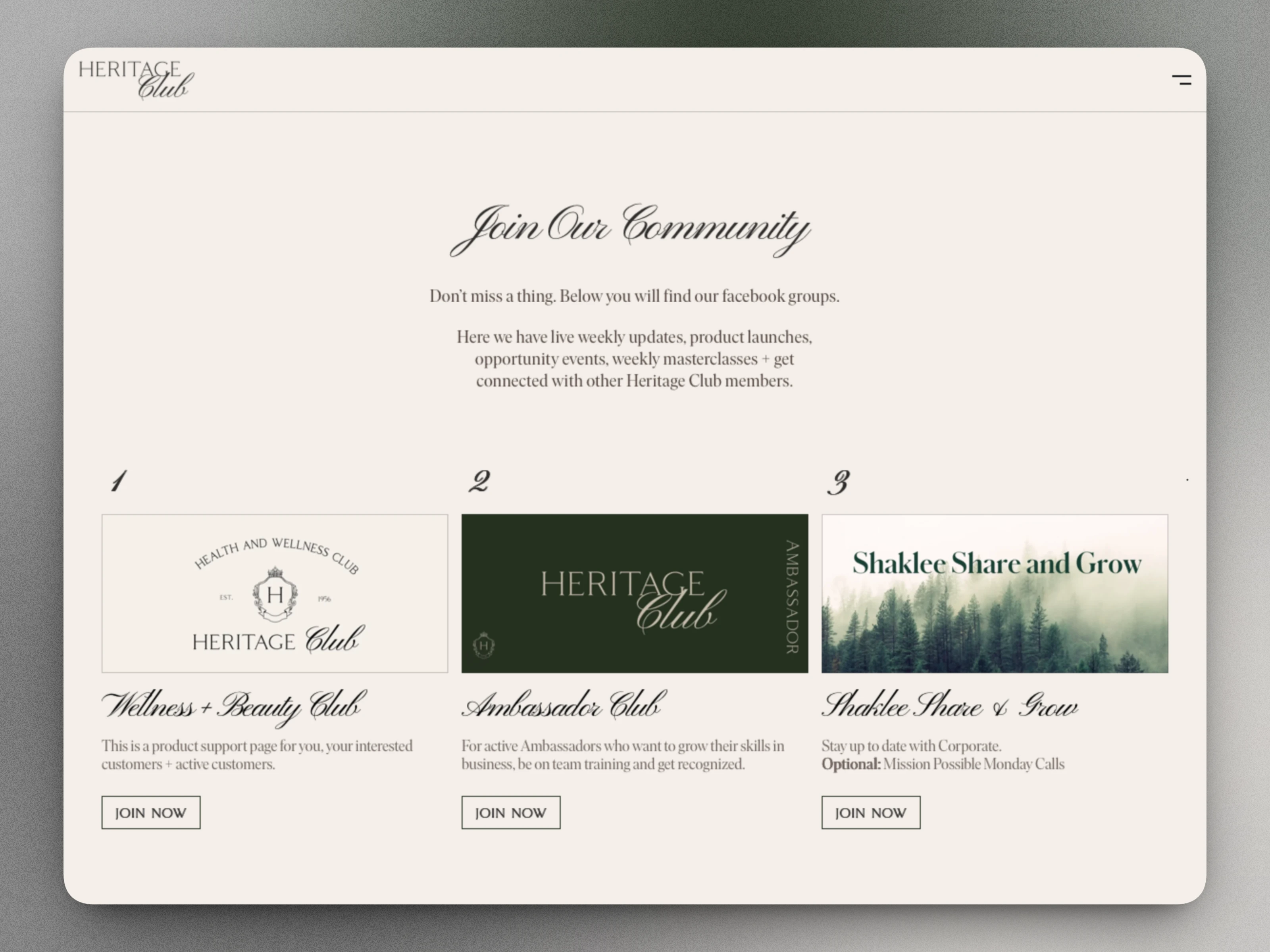 Imagery and visual assets were treated as supporting elements rather than focal points. Combined with a refined typographic system and generous white space, the result is a visual language that feels cohesive, confident, and aligned with the Heritage Club identity.